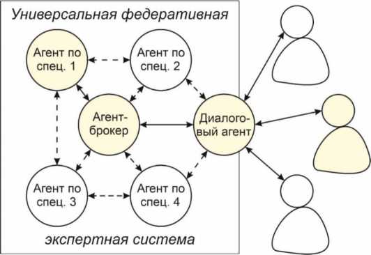 Так как описанные принципы обосновывают возможность функциональной специализации интеллектуальных агентов в составе федерации универсальной направленности, целесообразно для взаимодействия с пользователями экспертной системы синтезировать интеллектуального агента, специализирующегося на анализе тематики запросов и их распределении между агентами профильной специализации в составе федерации (агент-брокер). На рис. 4 приведена схема взаимодействия интеллектуальных агентов в составе универсальной федеративной экспертной системы с пользователями и друг с другом.