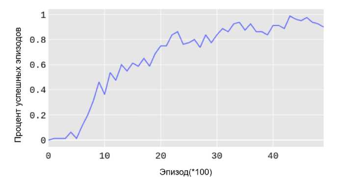 Для оценки эффективности модели использовалась метрика «Процент успешных эпизодов». Эта метрика определяется как процент эпизодов из каждых 100, в которых РТК успешно захватил и переместил объект в заданное положение. Формально уровень успеха рассчитывается так: