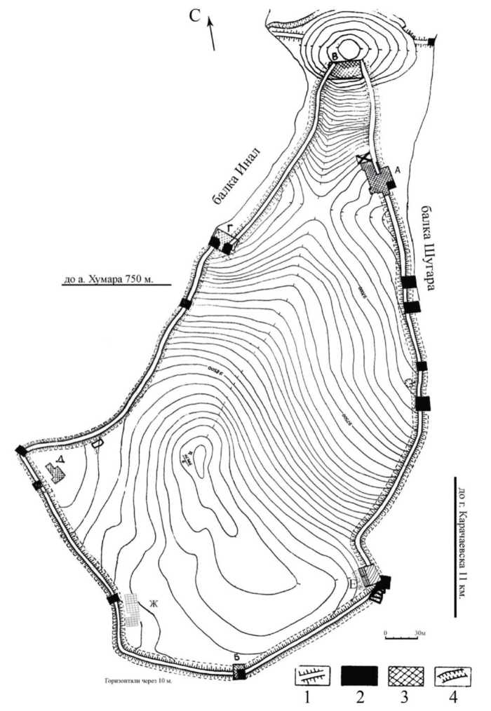 Сама природа сделала крепость практически неприступной – западный край плато, на котором она расположена, обрывается к долине реки Кубань, северный – защищен балкой Инал, а с юга и юго-востока – балкой Шугара (рис. 1).