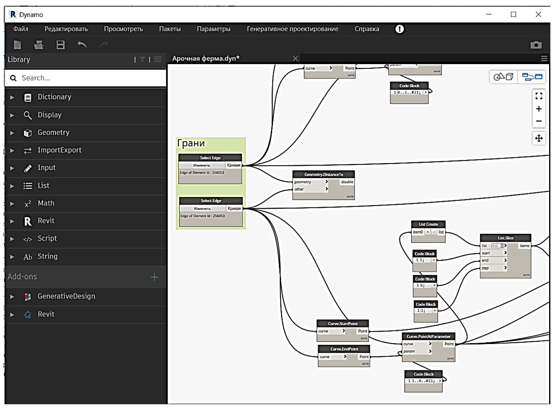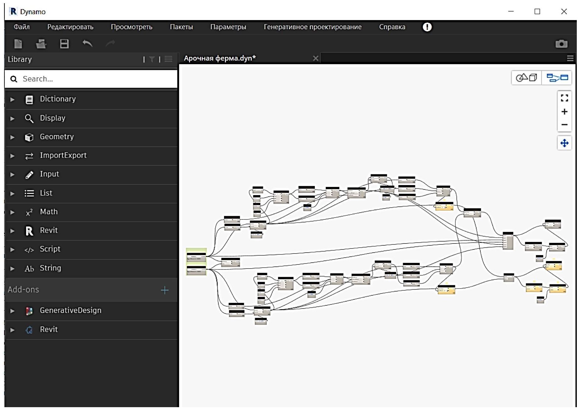 Dynamo – это среда визуального программирования. Она интегрирована с Revit и позволяет пользователям автоматизировать сложные проектные процессы, создавая алгоритмические модели [6]. Используя интерфейс визуального программирования, специалисты, не имеющие навыков программирования, могут создавать графические скрипты, с помощью которых выполняется управление параметрическими моделями. Использование Dynamo упрощает выполнение ряда сложных задач, например, изменение геометрии, расчет конструктивных элементов и анализ данных.