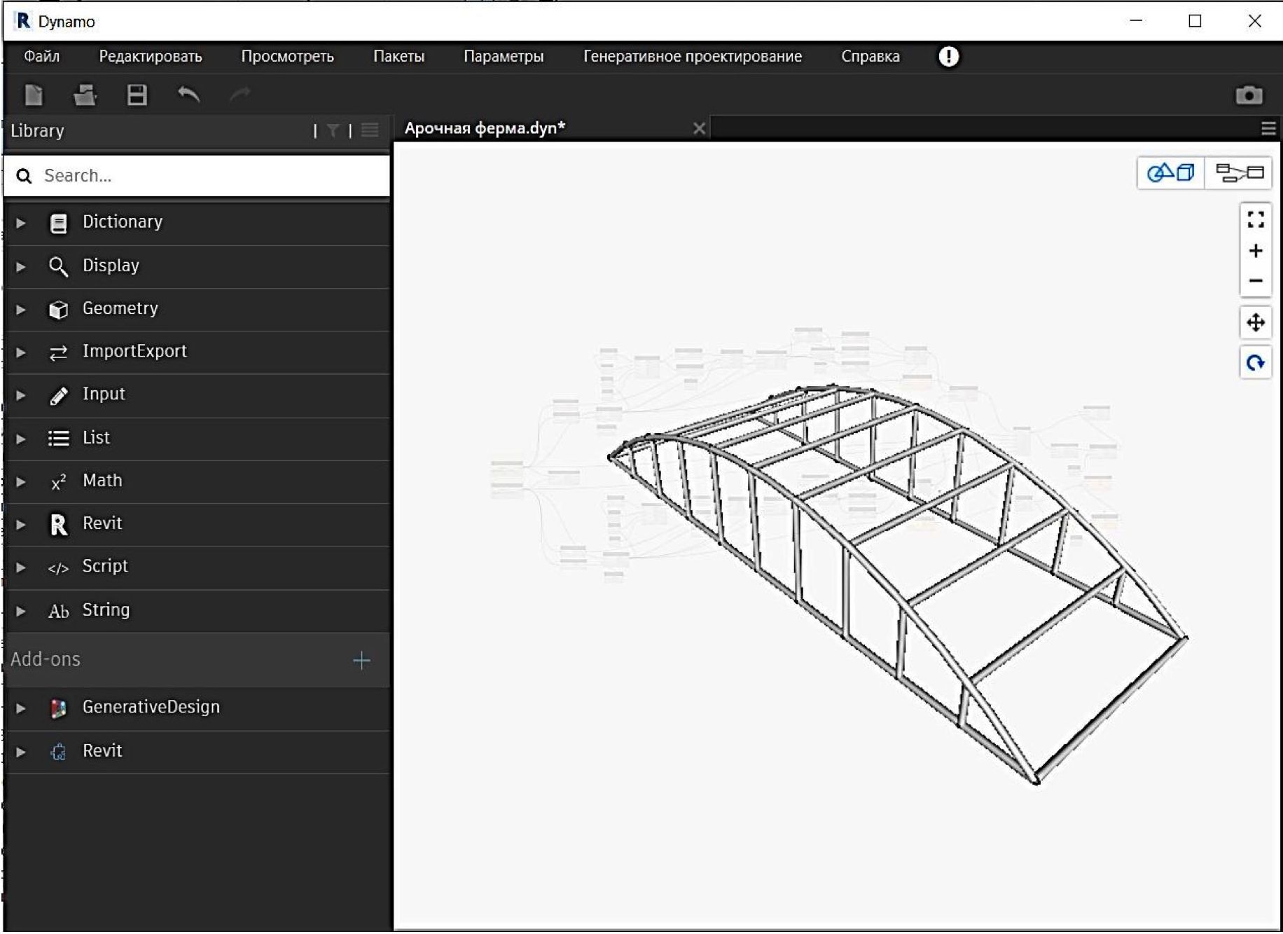 - Визуальное программирование в Dynamo – для автоматизации процесса построения и управления моделью арочной фермы на основе параметрических сценариев.
