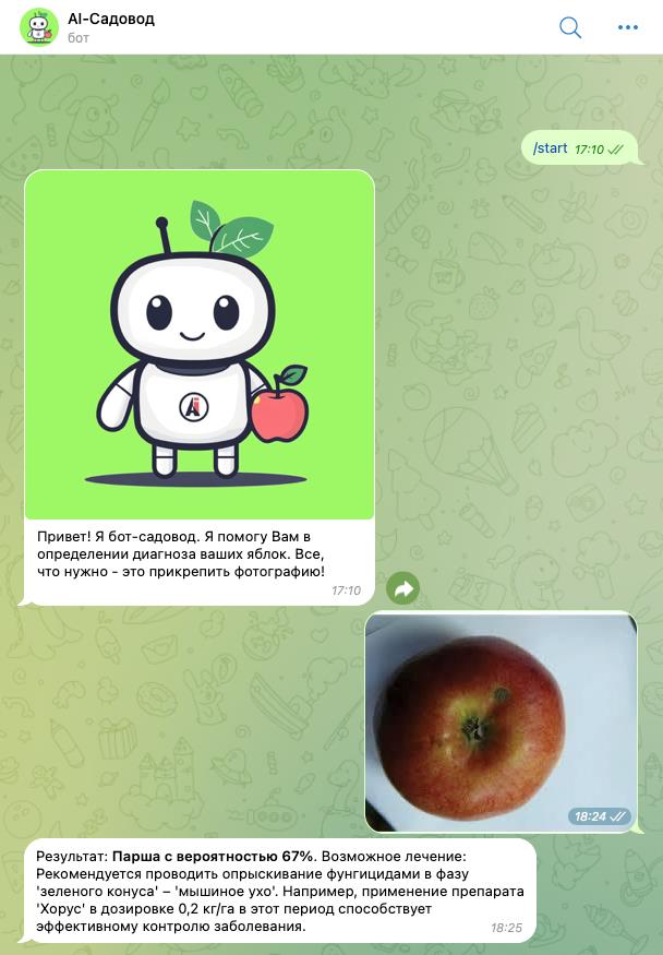 Представленный сервис позволит диагностировать заболевания яблонь с минимальными задержками по времени, а также обеспечить подбор методов защиты в случае необходимости. Это должно позволить снизить риски потери урожая садоводами Кабардино-Балкарской Республики. Тестирование программы показало применимость сервиса, в частности обеспечение распознавания базовых заболеваний, характерных для яблони, и выдачу рекомендаций по их защите (в том числе и в формате pdf-файла). Реализация сервиса в виде веб-приложения снимает необходимость портирования системы на различные платформы и максимально упрощает взаимодействие с системой. Применение чат-бота еще больше упрощает интерфейс пользователя.