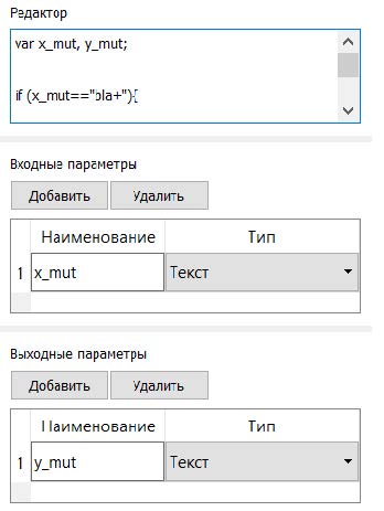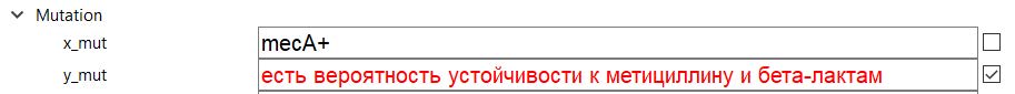 <relation id="97cbcf14-ac35-4fbd-b8a8-38eb5cf028ae" shortName="Mutations" inObj="x_mut:string" relationType="prog" outObj="y_mut:string">var x_mut, y_mut; if (x_mut=="bla+"){ y_mut="есть_вероятность_устойчивости_к_бета-лактамам"; } if (x_mut= "erm+"){ y_mut="есть_вероятность_устойчивости_к_эритромицину"; } if (x_mut= "mecA+"){ y_mut="есть_вероятность_устойчивости_к_метициллину и бета-лактам"; } </relation>