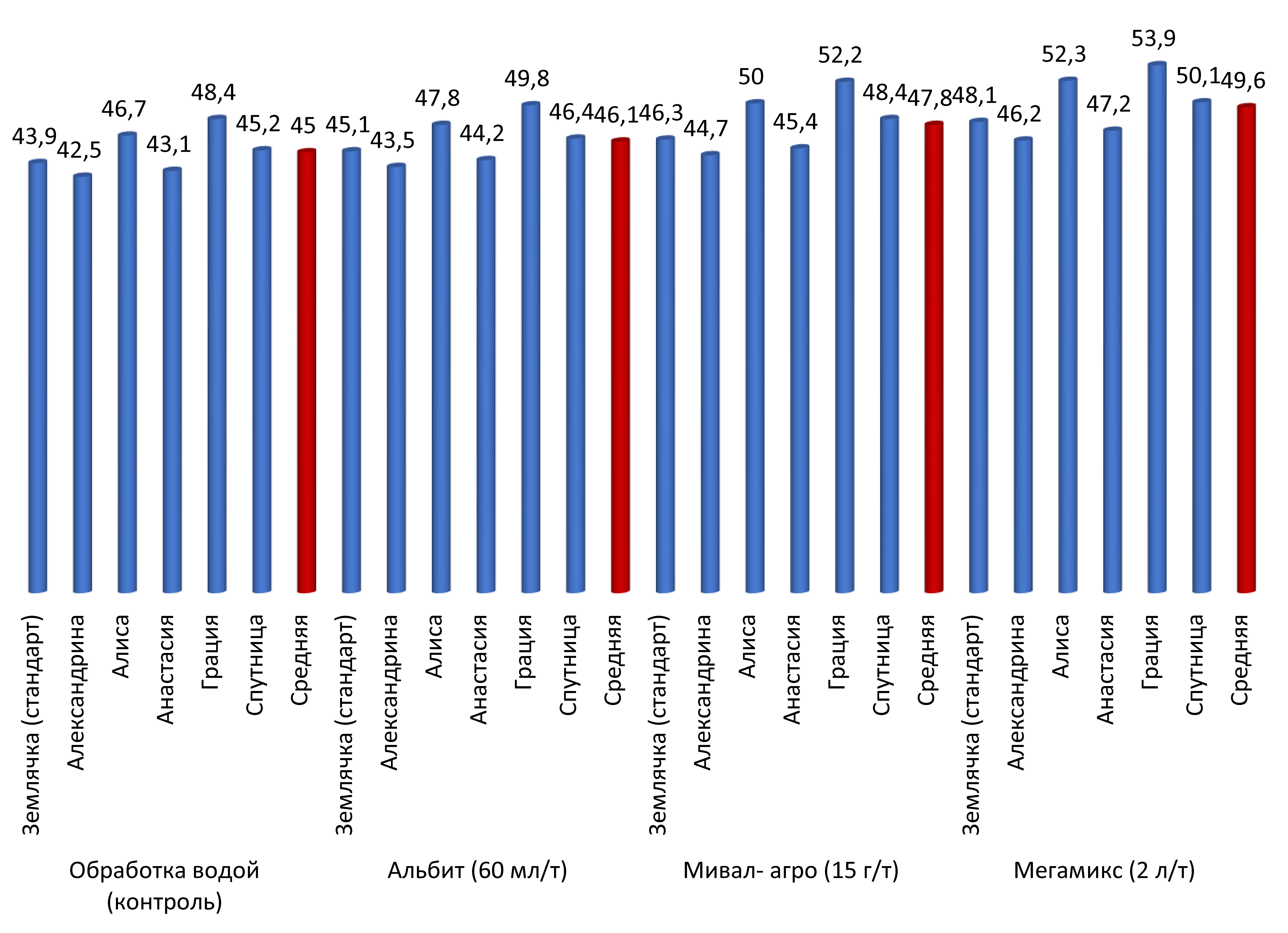На фоне применения ростового вещества Мивал-агро площадь листьев в среднем составила 47,8 тыс. м2/га, превышение по сравнению с первым вариантом (контроль) составило 6,2 %. Максимальную площадь листовой поверхности сорта суданской травы сформировали при применении стимулятора роста Мегамикс – в среднем 50,5 тыс. м2/га. Разница с данными контроля составила 10,7 %, а с данными регуляторов роста Альбит и Мивал-агро – 7,7 и 3,9 % (рис. 1).