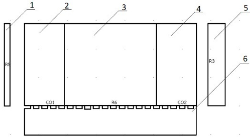 Рис. 7. Геометрическая модель для тепловой задачи: 1 – футеровка внутреннего индуктора; 2, 4 – внутренняя и внешняя области тепловыделения в заготовке; 3 – часть сечения заготовки без источников тепла; 5 – футеровка внешнего индуктора; 6 – площадка для установки кольца