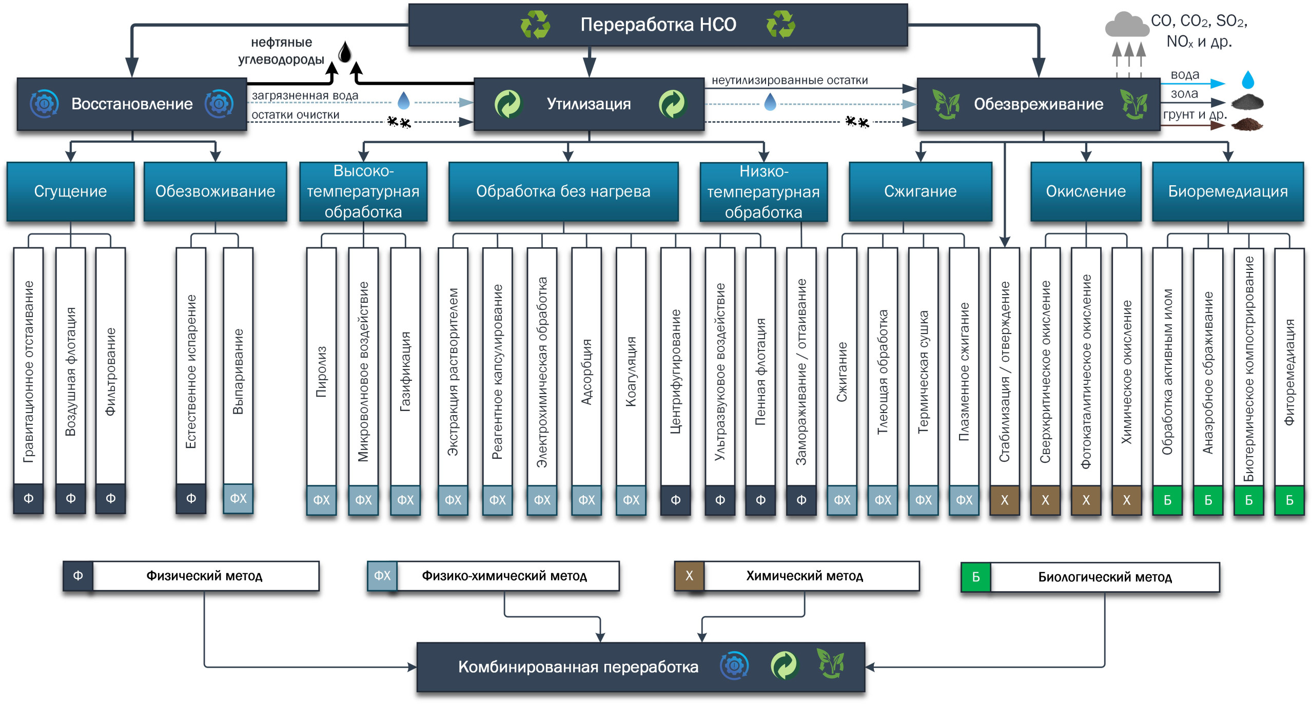 Существующие подходы к классификации НСО в основном разделяют технологии переработки на два направления обращения с отходами: утилизацию и обезвреживание [18; 20; 22–24] (см. рис. 1, 2). Такая классификация не учитывает выраженные функции технологий по очистке жидких НСО физическими методами (фильтрация, флотация, гравитационное разделение и др.) в основном от механических и минеральных примесей и предназначенных, по сути, для восстановления сырья на основе нефтяных углеводородов и его дальнейшего вторичного использования [27; 28]. Кроме того, комбинирование различных технологий переработки НСО может дать синергетический эффект от их применения [28].