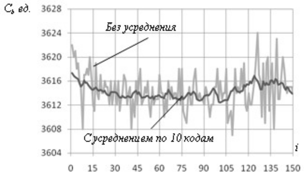 На рис. 2 представлен фрагмент выборки кодов (Ci) объемом 150 отсчетов, полученный при опросе измерительного канала с ОВТД1. Анализ показал, что большая часть кодов не выходит за пределы разброса в ±4 единицы. СКО составило 3,09 единицы. Его относительное значение, приведенное к диапазону изменений выходных кодов (1332 единицы кода), составило 0,23 %. Аналогичные результаты были получены и для измерительного канала с ОВТД2.