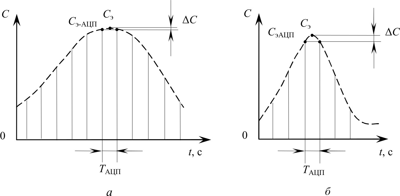 Идеализированные функции изменения кодов АЦП во времени C(t) показаны пунктиром, а их экстремальные значения обозначены Cэ. На тех же рис. 3, а, б показаны дискретные значения функции C(t), полученные в результате аналого-цифрового преобразования выходного сигнала ИЦ. Ближайшие по значению к Cэ отсчеты обозначены Cэ-АЦП. Наибольшая разность между реальным экстремумом Cэ-АЦП и идеальным Cэ будет в случае, когда соседние дискретные отсчеты в окрестности Cэ будут равноудалены от Cэ по времени. Эта разность рассматривается далее как погрешность дискретизации, связанная с изменениями скорости вращения ротора ТНА: