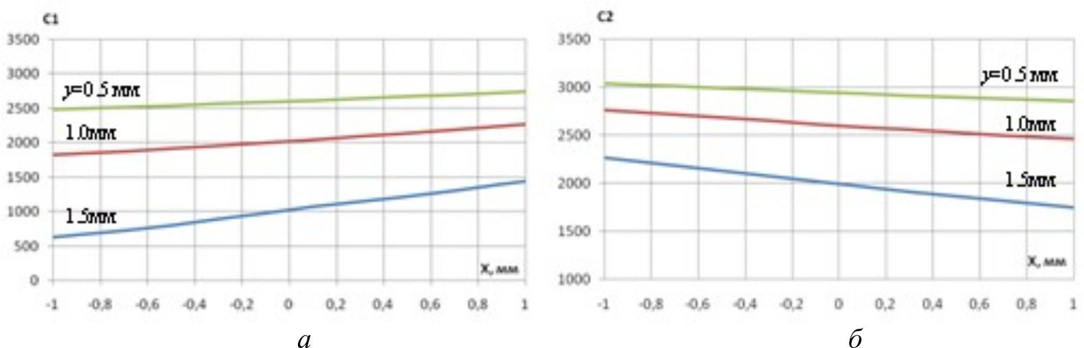 На рис. 5 в графическом виде представлены градуировочные характеристики измерительных каналов системы контроля состояния РУП для ОВТД1 (C1(x,y), рис. 5, а) и ОВТД2 (C2(x,y), рис. 5, б), полученные в диапазонах изменения радиальных зазоров от 0,5 до 1,5 мм с шагом 0,5 мм и осевых перемещений измерительного диска от –1,0 до +1,0 мм и шагом 0,2 мм.