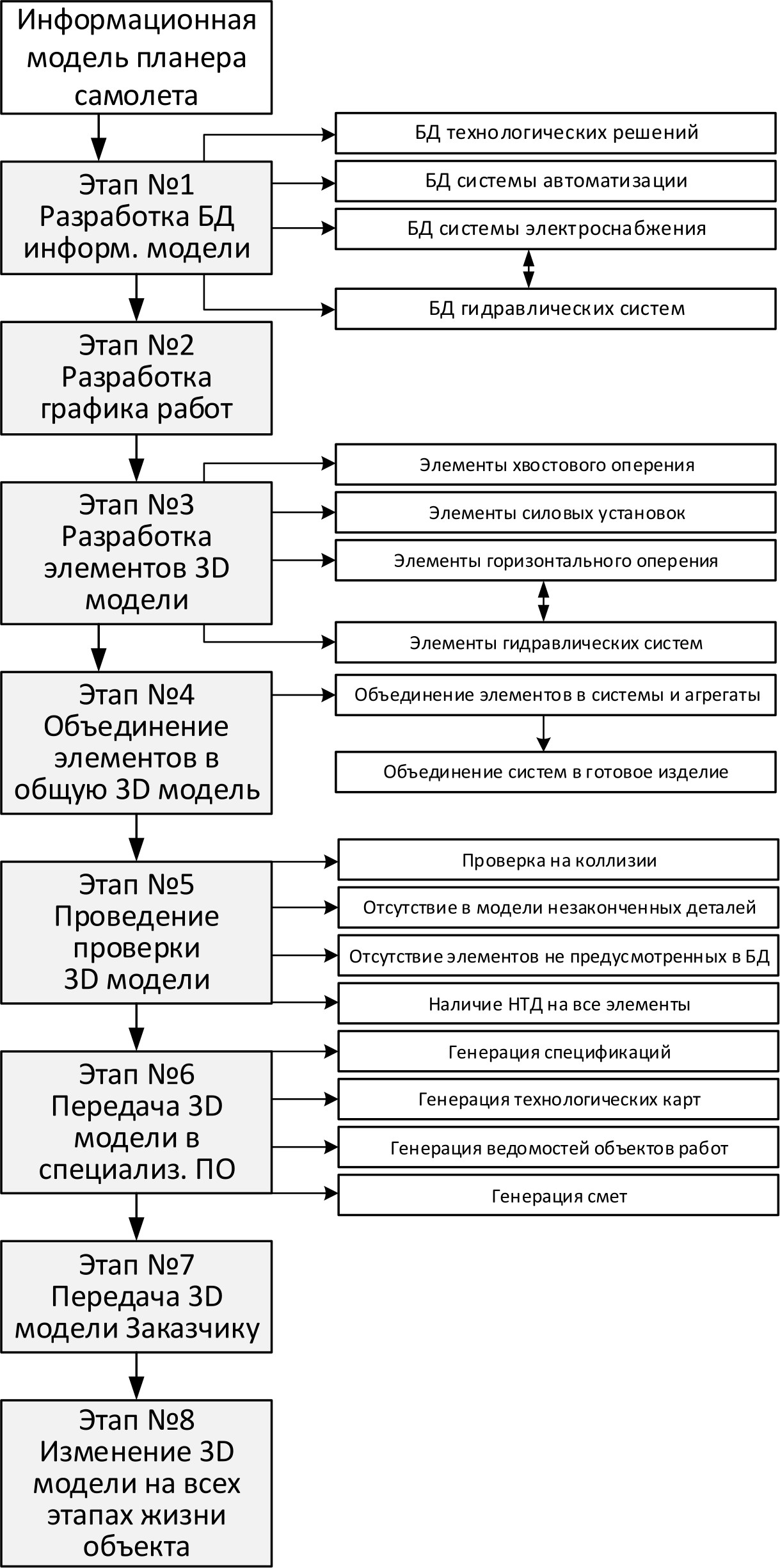 Ниже представлена разработанная методология процесса проектирования самолета с использованием информационной модели (ИМ), которая предусматривает учет всех особенностей, характеризующих 3D-модель и связанные с ней объекты проектирования [9].