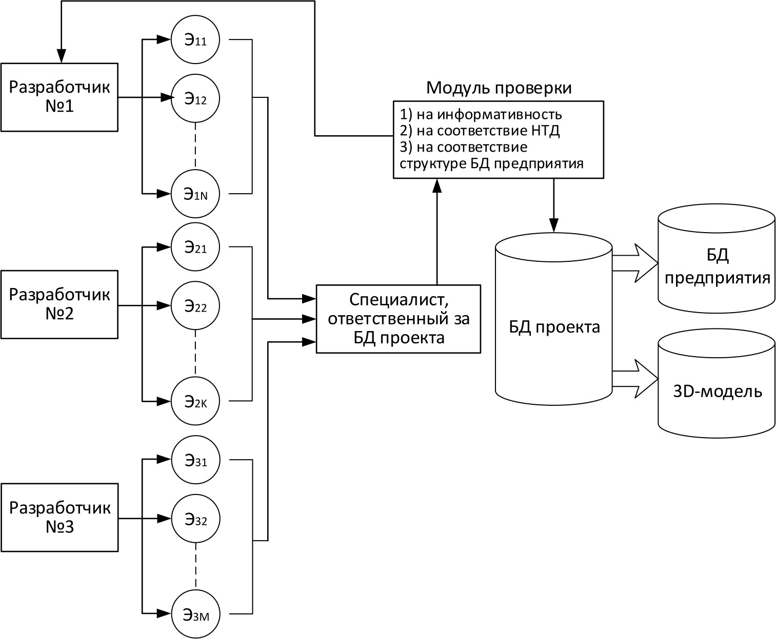 На этапе № 1 производится контроль действий отдельных специалистов, которые направляют сведения об отдельных элементах информационной модели в общую БД проекта.