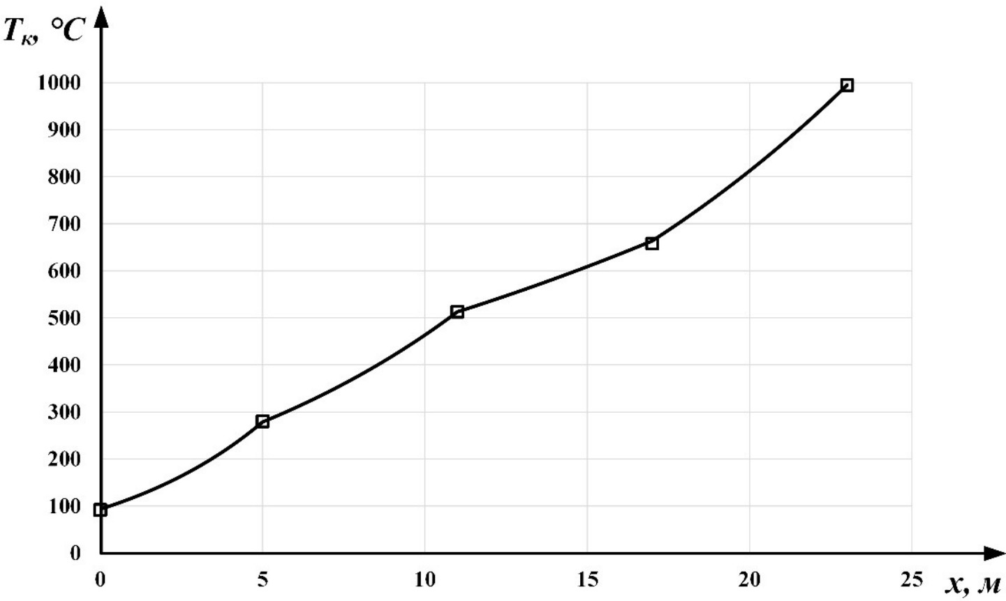 В результате расчета с использованием представленных выше математических зависимостей получен участок температурной кривой кирпича, соответствующий зоне охлаждения (рис. 2). Следует отметить, что маркерами обозначены значения температуры в характерных точках (на входах и выходах рассматриваемых четырех участков) зоны охлаждения действующей туннельной печи [11], которая работает в аналогичных расчетным технологических условиях. Оценим точность математической модели статического режима работы зоны охлаждения керамического кирпича. Произведя сравнение в указанных точках расчетных значений Tк и значений Tкн температур кирпича, полученных на реальной установке, можем увидеть (см. табл. 2), что максимальная погрешность δ наблюдается при x=0 MathType@MTEF@5@5@+= feaahGart1ev3aqatCvAUfeBSjuyZL2yd9gzLbvyNv2CaerbuLwBLn hiov2DGi1BTfMBaeXatLxBI9gBaerbd9wDYLwzYbItLDharqqtubsr 4rNCHbGeaGqiFGI8VfYJH8XrFfeuY=Hhbbf9v8qqaqFr0xc9pk0xbb a9q8WqFfea0=yr0RYxir=Jbba9q8aq0=yq=He9q8qqQ8frFve9Fve9 Ff0dmeaabiqaciGacaGaaeqabaWaaeaaeaaakeaacaWG4bGaeyypa0 JaaGimaaaa@3835@  и составляет 1.63 %. Поэтому можно сделать вывод об адекватности разработанной математической модели.