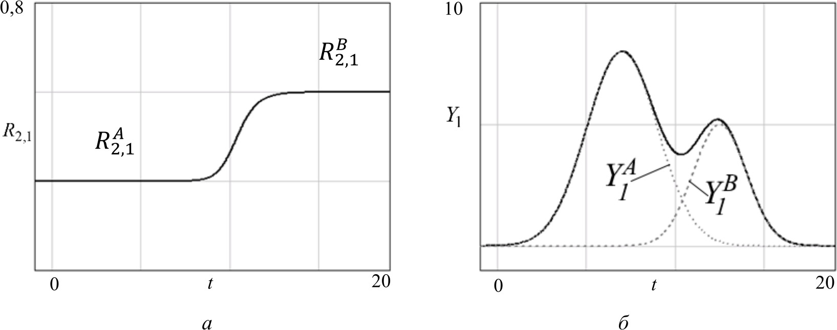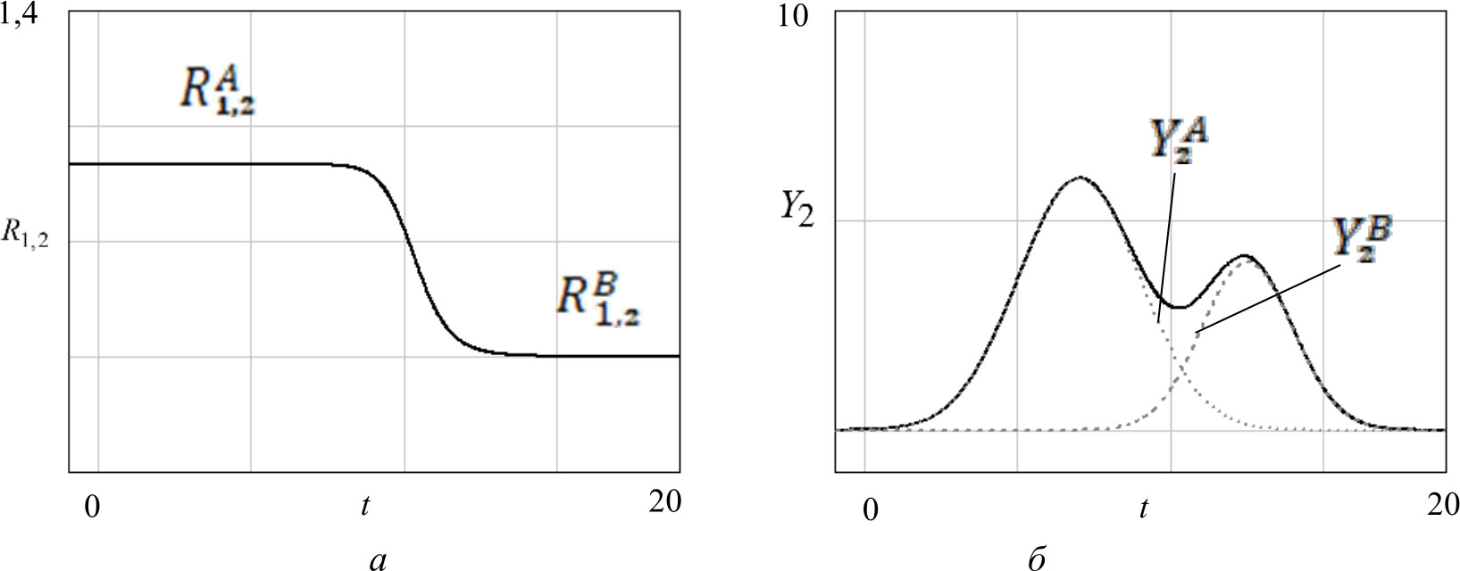 Для получения численных значений Y2A и Y2B необходимо знать коэффициенты отношений R1,2A, R1,2B, которые находятся из графика R1,2 отношения сигналов Y1 к Y2 (см. рис. 2, а).
