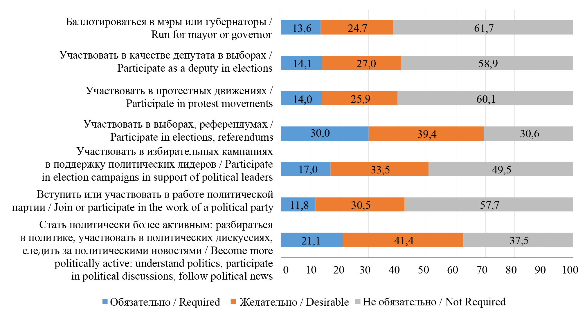 Участвовать в качестве депутата в выборах / Participate as a deputy in elections | 12,6 | 15,9 | 13,5 | 16,5 | 16,9 | 13,1 | 11,6 | 14,1 |