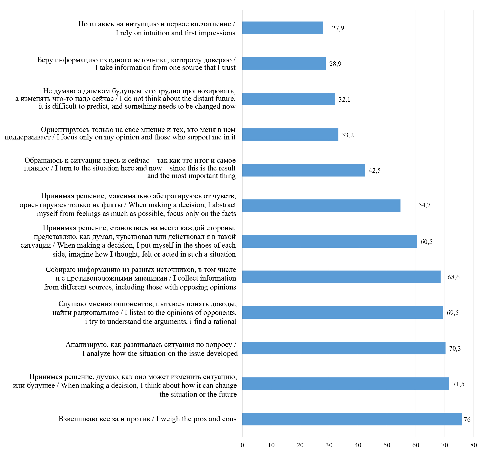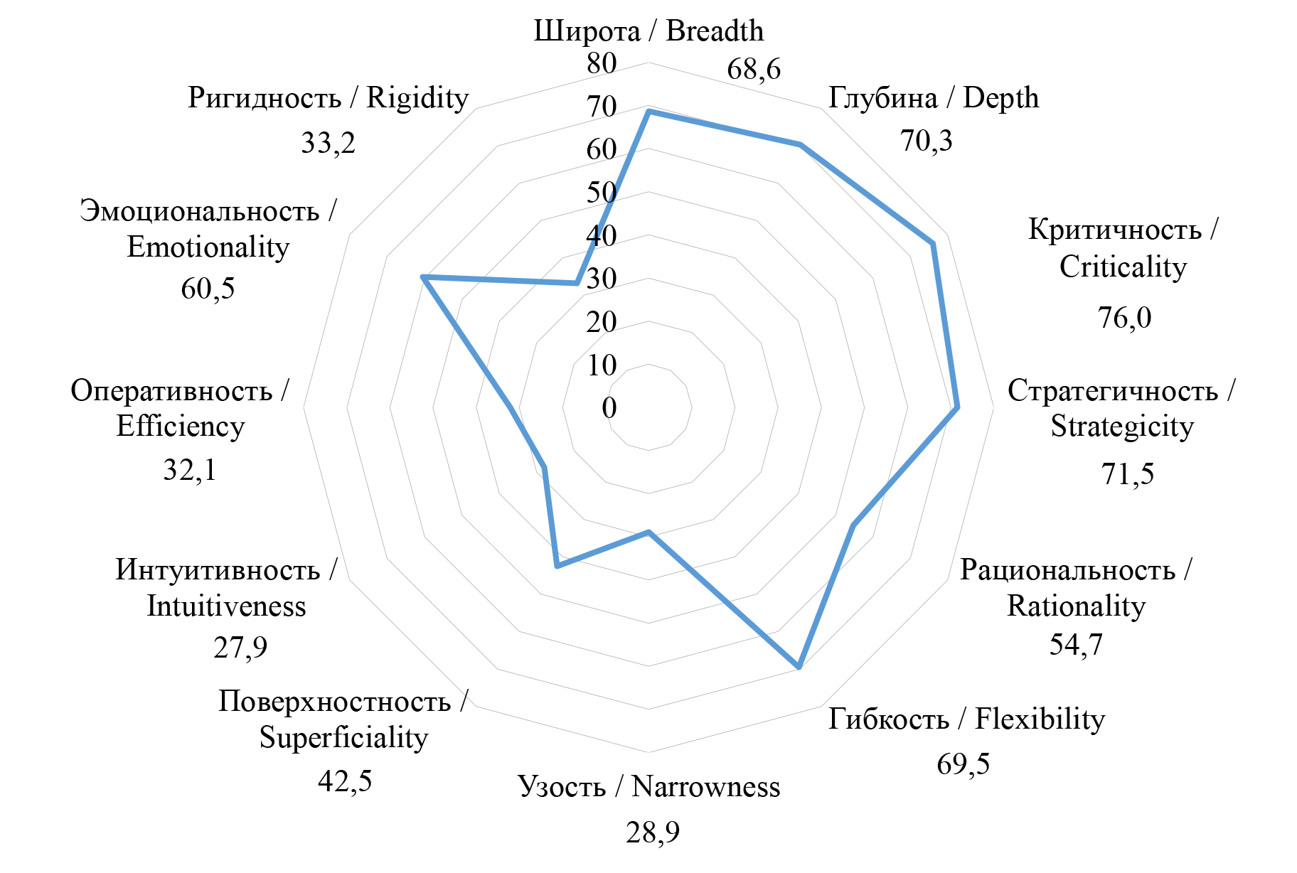 Превалирование практически для 70 % опрошенных широты, глубины, критичности, стратегичности и гибкости мышления определено верификацией показателей характеристик политического мышления молодежи. Данные характеристики показывают склонность респондентов осуществлять в процессе анализа политической информации следующие действия: собирать информацию из разных источников, в том числе с противоположными мнениями; анализировать развитие ситуации по политическому вопросу; взвешивать все за и против; думать при принятии решения о последствиях для конкретной ситуации или будущего в целом (при выборе политика или поддержки политической инициативы); слушать мнения оппонентов, пытаясь понять их доводы, найти в них рациональное объяснение.
