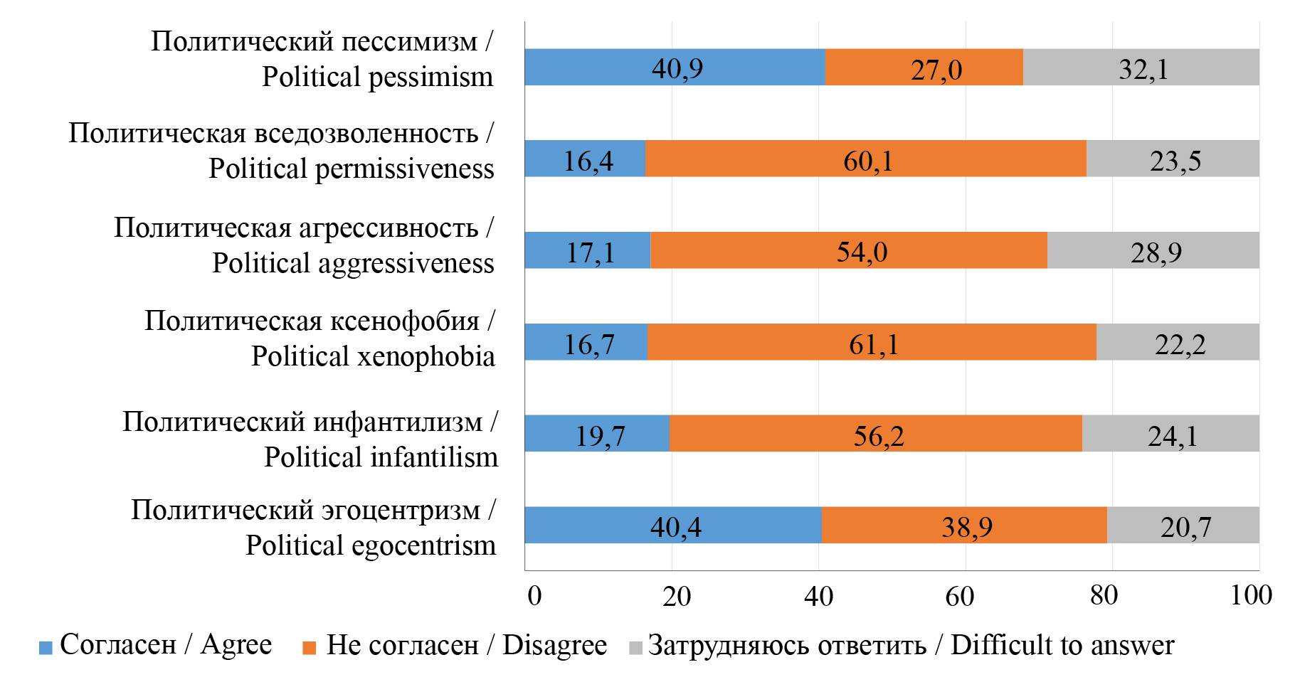 Политический инфантилизм / Political infantilism | 19,3 | 18,6 | 20,8 | 26,0 | 22,0 | 17,8 | 19,0 | 19,7 |