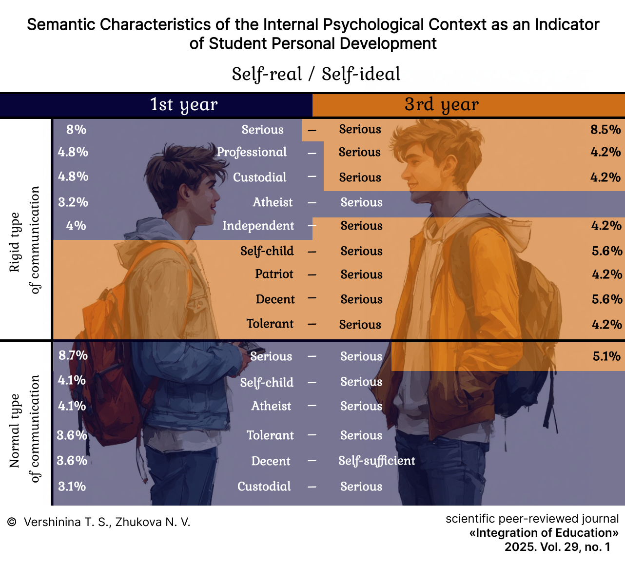 Materials and Methods. The study involved first-year and third-year students from two universities in Yekaterinburg (conducted between 2022 and 2023). The semantic characteristics of the students’ internal psychological context were analyzed using Kelly’s repertory grid method. The significance of the differences in results between student groups was demonstrated using Pearson’s χ² test. The respondents’ repertory grids were analyzed using the co-therapeutic computer system “KELLI,” descriptive statistics, and mathematical statistics (Statistica v. 12).