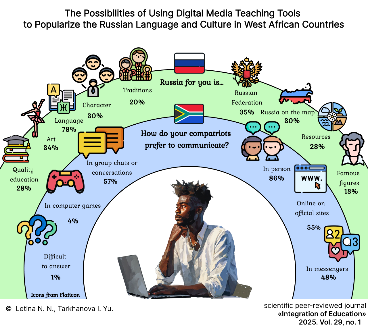 В ходе исследований на базе центров открытого образования в Кот-д’Ивуаре и Гане выявлено отсутствие в школьных учебниках информации о России и ее культуре (найдено 7 упоминаний о географическом положении страны). Анализ ресурса с цифровыми учебными материалами для африканских школ показал отсутствие контента относительно русского языка и российской культуры2. Анализ онлайн-платформ для изучения русского языка как иностранного (Learn Russian, Russian on-line, Время говорить по-русски, Образование на русском и др.) зафиксировал дефицит учебных материалов для изучения русского языка и российской культуры, учитывающих особенности целевой аудитории стран Западной Африки: приоритет сохранения этнической самобытности, высокую восприимчивость к невербальным средствам обучения (музыка, ритм, моторика и язык телодвижений), экспрессивность и простоту языковых форм, интерес к современной социально-бытовой жизни россиян. Это свидетельствует о необходимости теоретико-методологического обоснования, разработки и апробации цифровых дидактических решений для популяризации русского языка и культуры в странах Западной Африки (на примере Кот-д’Ивуара и Ганы) с учетом особенностей и традиций национальной культуры и культурно-образовательных потребностей представителей вероятной целевой аудитории.