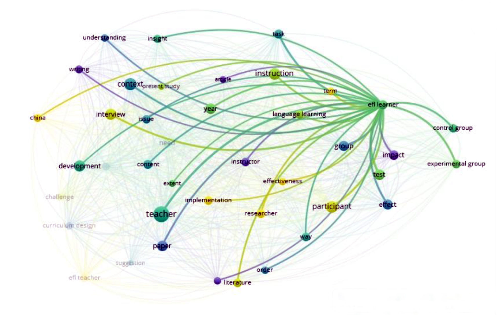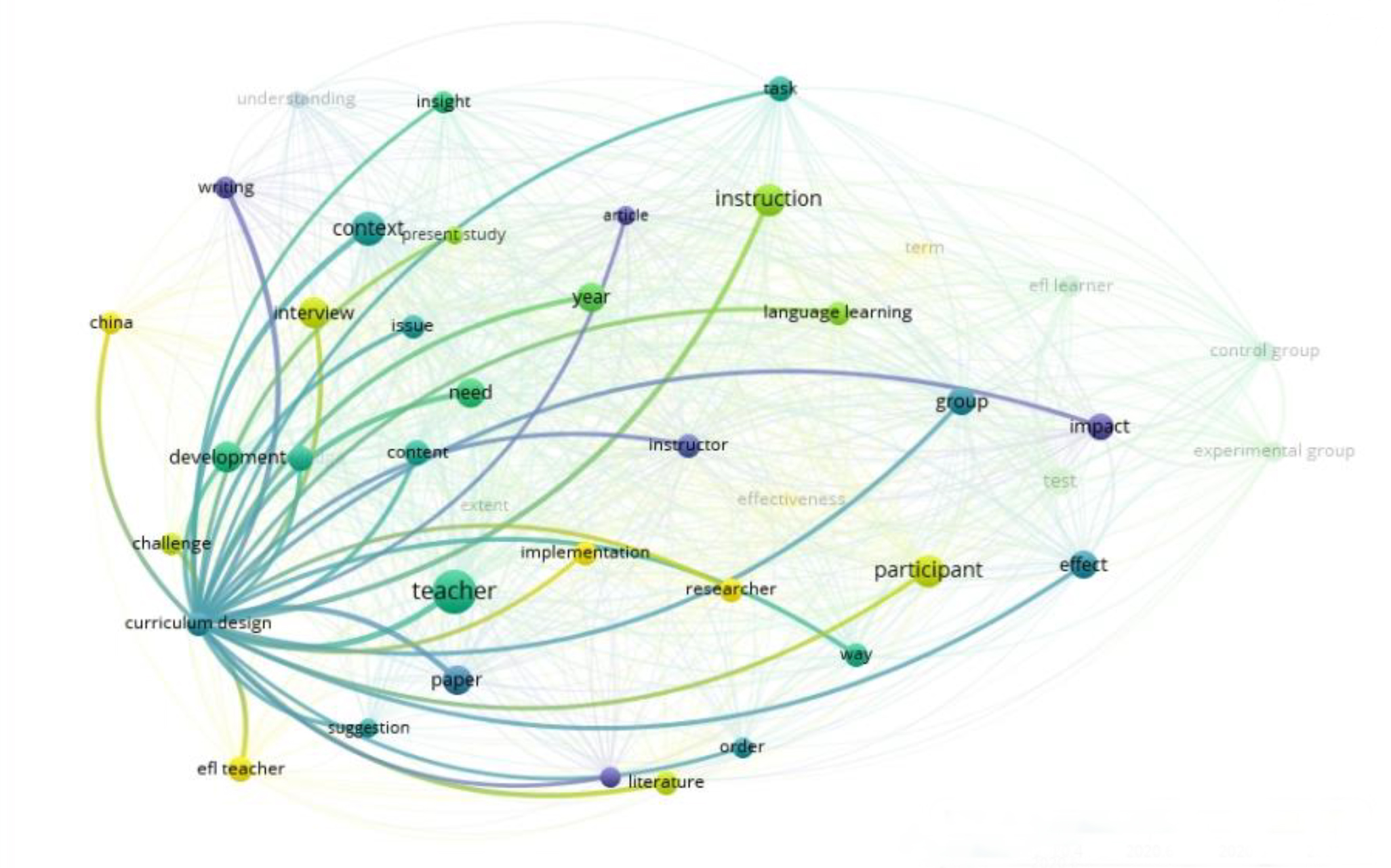 Through bibliometric mapping via VOSviewer (1.6.19 version), the connections between heatedly discussed key words in 112 articles under the topic of “EFL curriculum design” indexed in WOS core collections, from 2018 till now, are visualised (fig. 3).