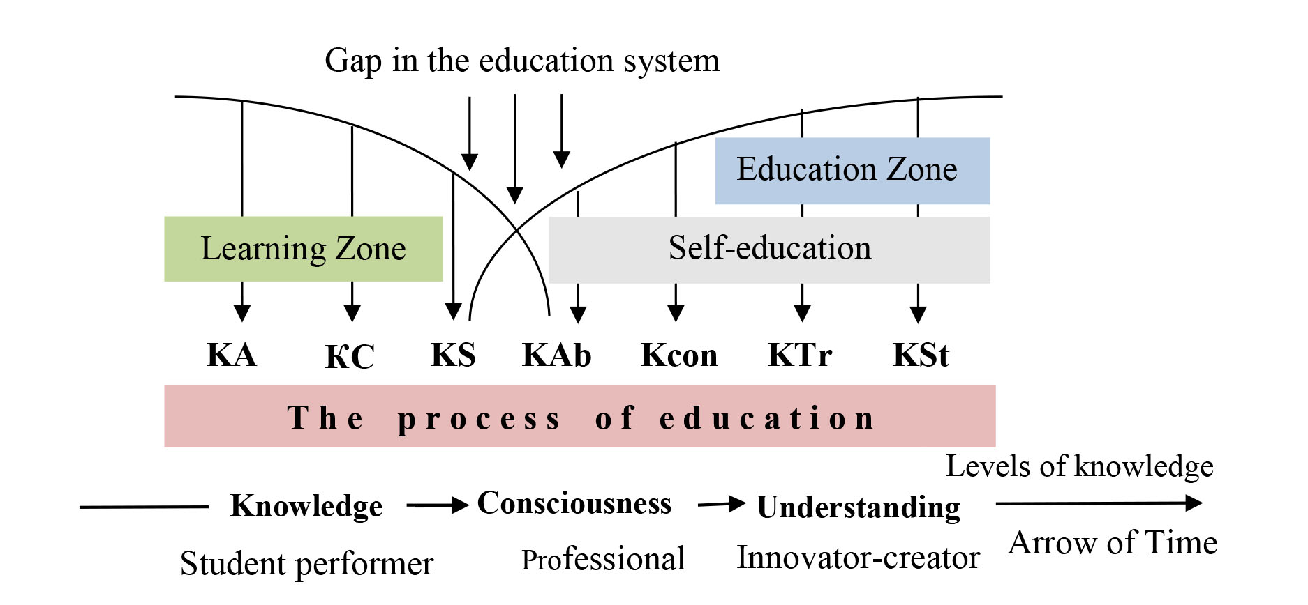 При наложении дополненной нами системы знаний на ось, совпадающую со стрелой времени (поскольку формирование последующих уровней знаний без предыдущих невозможно) появляется возможность их группировки по зонам обучения и образования (рис. 1).