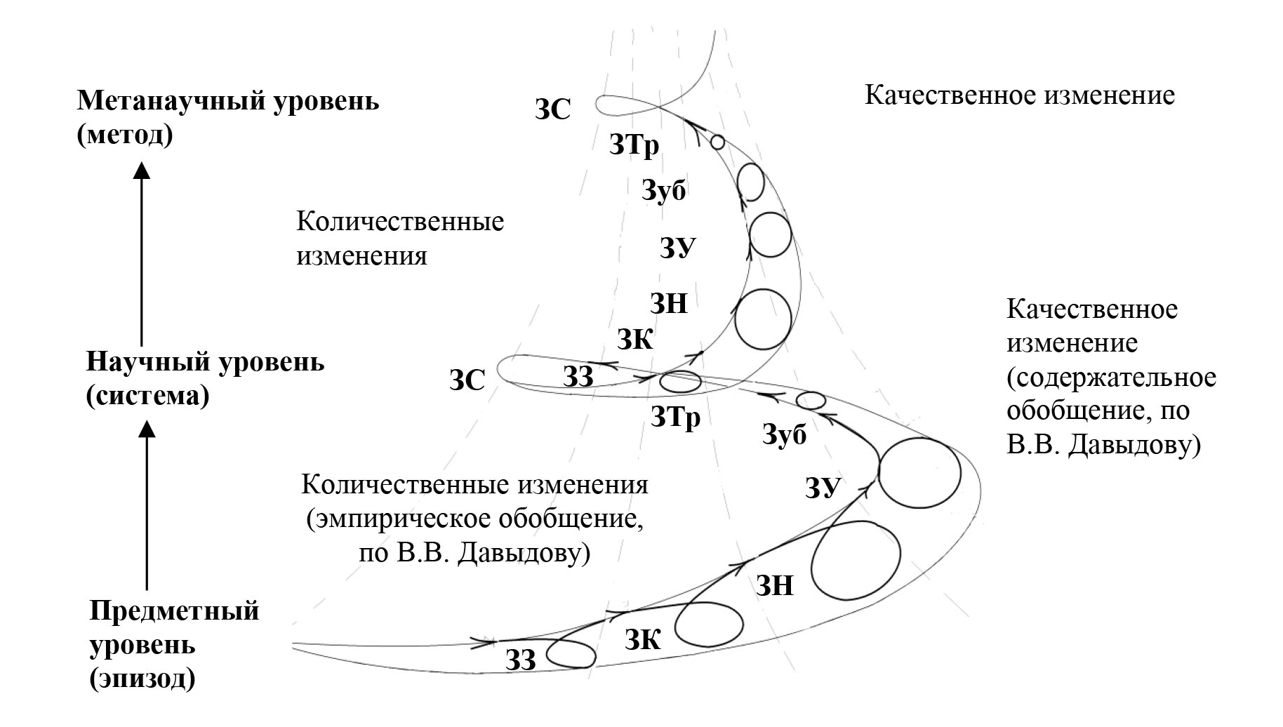В витках спирали познания предложенной нами модели (рис. 2) наблюдается преемственность идеям С. И. Гессена31. Нижний виток модели содержит эволюционный ряд знаний предметного уровня (эпизод), виток над ним – знаний науки (системы), выше – виток знаний метанауки (метода).