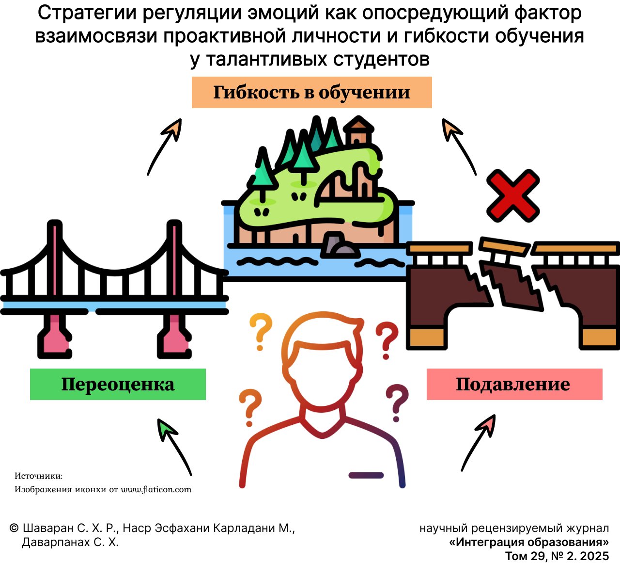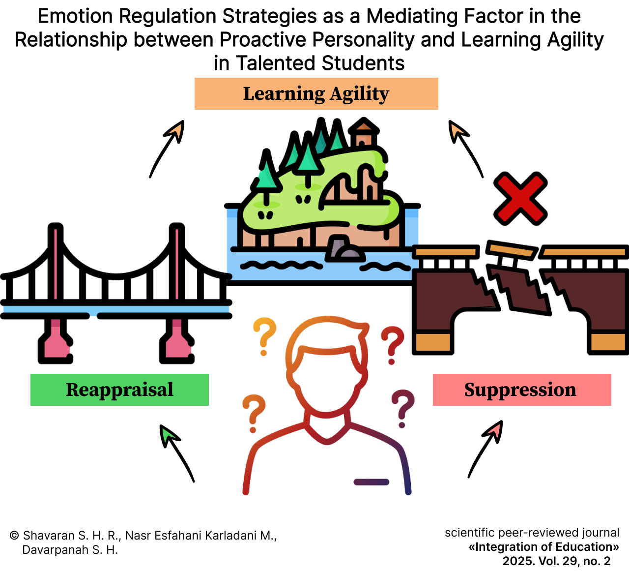 Introduction. Although previous research has separately addressed proactive personality and emotion regulation, the combined effect of these variables on learning agility – particularly among talented students – remains underexplored. This study fills this gap by focusing on how specific emotion regulation strategies mediate this relationship. In today’s rapidly evolving educational landscape, learning agility has emerged as a crucial meta-competency for adapting to new challenges. This study investigates how emotion regulation strategies mediate the relationship between proactive personality and learning agility among talented students. With the increasing recognition of the role of personality traits and emotion regulation in effective learning, understanding these dynamics is essential for supporting students in navigating academic and social demands.