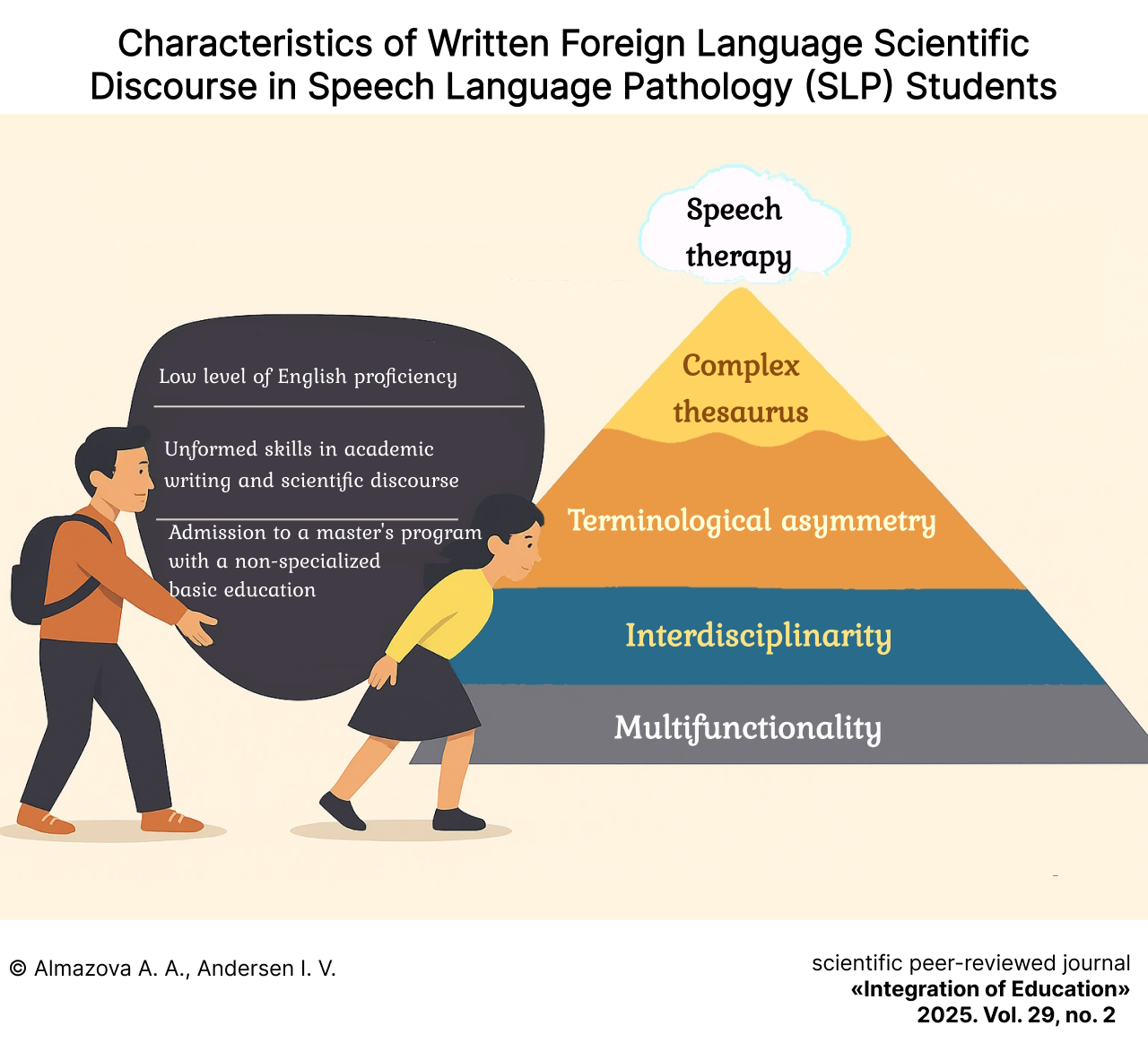 Introduction. Speech-language pathology is a complex field of scientific knowledge based on broad interdisciplinary foundations. It shapes the specifics of the professional thesaurus and significantly complicates the formation of scientific discourse among future specialists. The study aims to conceptualise and test a novel pedagogical model for developing foreign-language scientific discursive competence in speech-language pathology students through the integration of thesaurus and corpus approaches, designed to eliminate terminological asymmetry. The article presents the results of a diagnostic experiment assessing the level of foreign-language scientific discursive competence using methods of contrastive terminography and discourse analysis applied to empirical data (questionnaires, written assignments, translations). The experiment identified gaps in students’ mastery of professional terminology, genre norms of academic writing, and cross-linguistic communication skills.