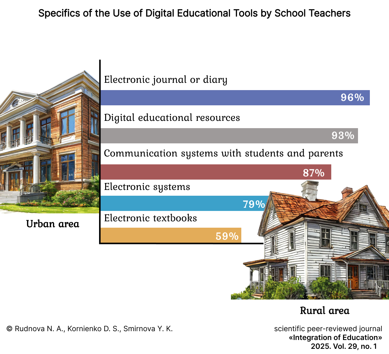 Results. Electronic gradebooks or diaries are a popular digital tool, while digital educational resources and communication systems with students and parents are used less frequently. E-textbooks proved to be an unpopular digital tool. Educators more frequently use digital technologies for communication with colleagues and students, and less often for planning extracurricular activities and implementing project-based learning. Comparative analysis shows that young specialists frequently use lesson planning systems, while teachers with over 30 years of experience more often use digital technologies for attendance tracking. Primary school teachers utilize digital technologies more often than others. Educators in larger population centers use digital technologies for attendance tracking, extracurricular activity planning, and communication.