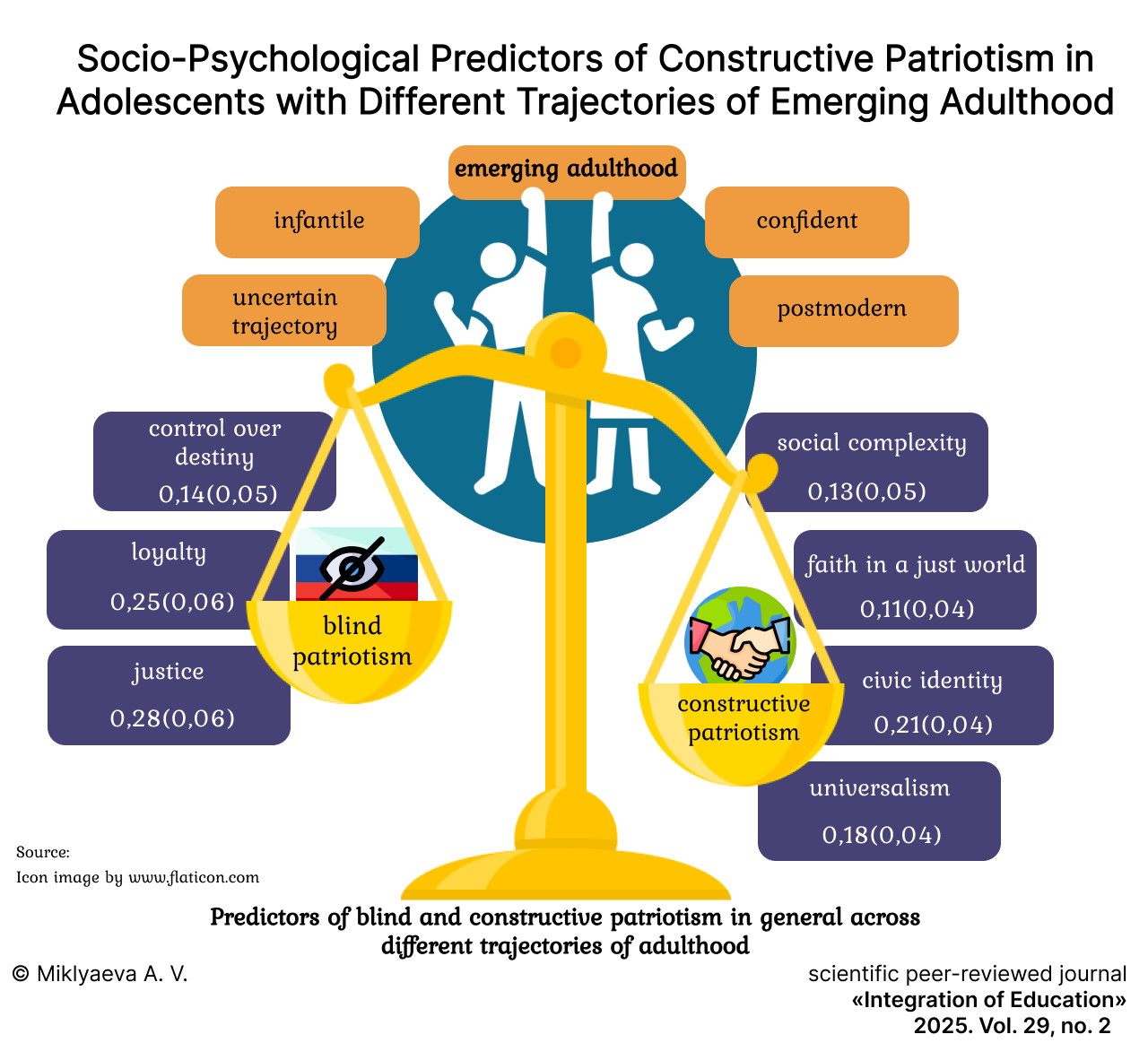 Results. Universal predictors of constructive patriotism in adolescents, regardless of their demonstrated trajectories of maturation, are indicators of civic identity, the value of universalism, belief in a just world, and the social axiom “social complexity.” Socio-psychological predictors of constructive patriotism that diffe­rentiate subgroups of adolescents with different trajectories of maturation are indicators of the bases of moral choice “Respect” and “Justice,” as well as the social axioms “Reward for effort” and “Social cynicism”.