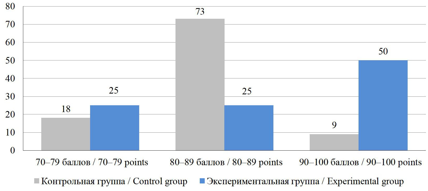 Р и с. 3. Распределение баллов за творческий экзамен (рисунок, живопись) в контрольной и экспериментальной группах, 2022 г., %
