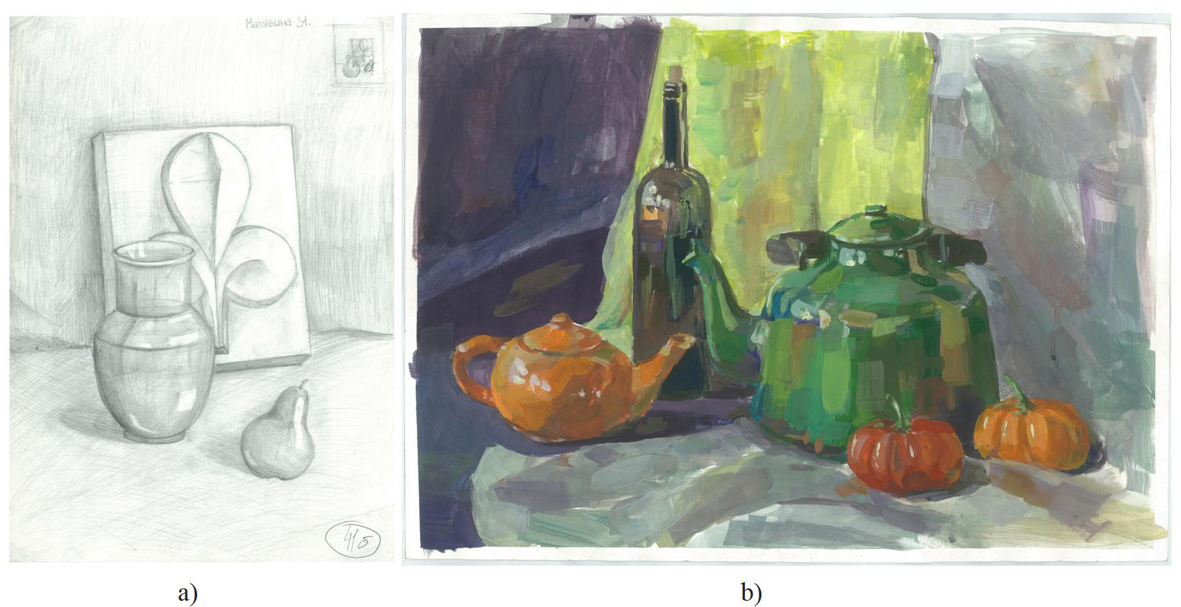 Примеры работ творческого экзамена, выполненных на средние баллы (рисунок, живопись) представлены на рисунке 4.