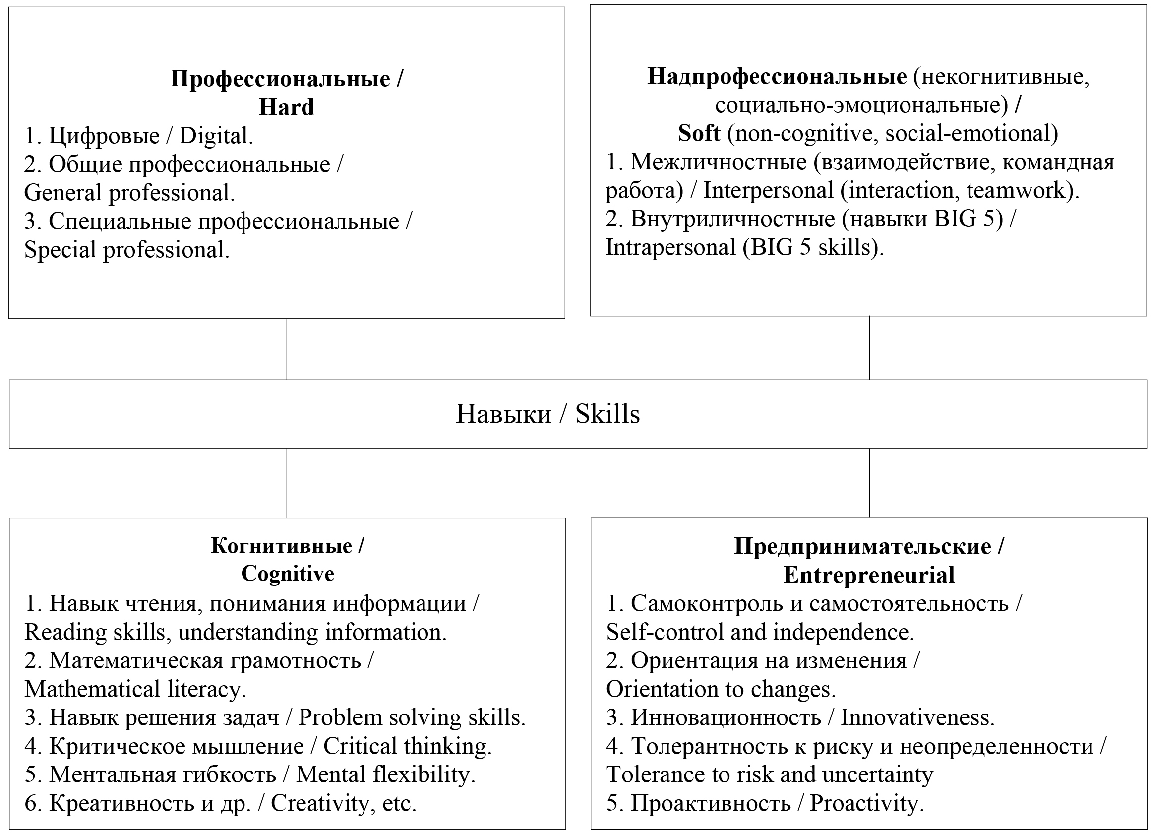 Когнитивные навыки фундаментальны по отношению к профессиональным навыкам, поскольку люди с развитыми когнитивными способностями легче ликвидируют дефицит в различных профессиональных компетенциях15; представляют собой универсальные навыки, позволяющие отдельным индивидам адаптироваться к усложняющейся, нестабильной реальности и преуспевать в ее условиях16. К этим навыкам относятся фундаментальные человеческие навыки: чтения и понимания информации, математической грамотности (владения абстрактным мышлением и оперирования числом), а также быстрого решения задач в различных условиях, в том числе с использованием IT-технологий и гаджетов, и др.17