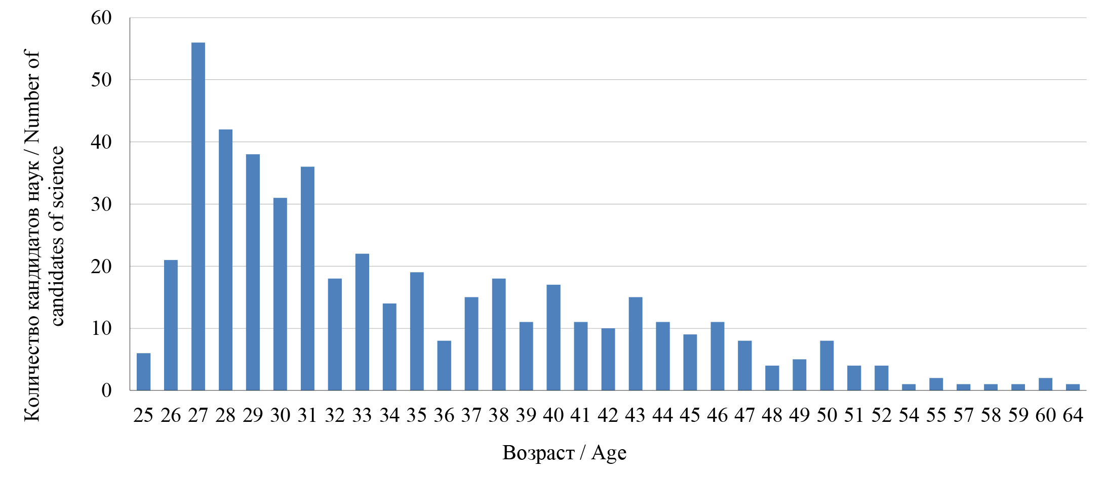 На рис. 1 показано общее число защит соискателями ученой степени кандидатских диссертаций в 2024 г. в разрезе возрастов по экономическим наукам. Наиболее высокие показатели присуждения ученой степени кандидата наук по экономике соответствуют возрастам в промежутке между 27 и 31 годами.