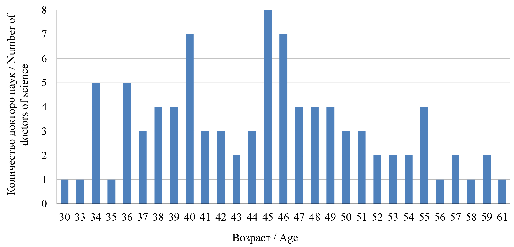 Численность защит соискателями ученой степени докторских диссертаций в 2024 г. в разрезе возрастов по экономическим наукам представляет интерес с учетом вариативности полученных данных. Наиболее высокие показатели присуждения ученой степени доктора наук по экономике соответствуют возрастам 34, 36, 40, 45–46 лет (рис. 4). Контрастный характер возрастной характеристики защит докторских диссертаций по экономике отмечается низкими показателями возрастов 35, 41–44 гг.