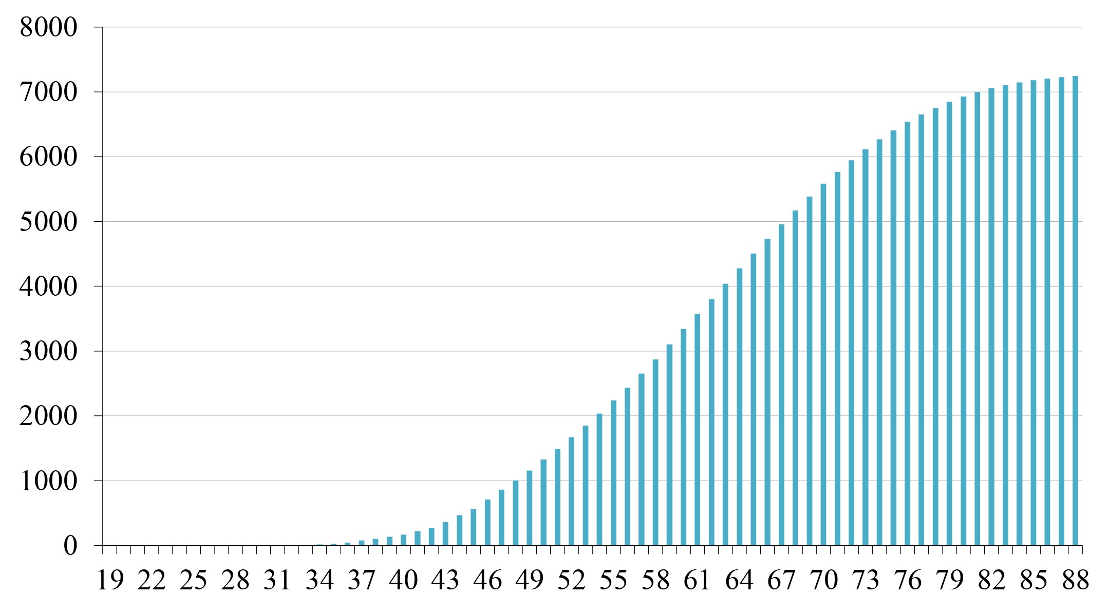 Р и с. 3. Возрастная структура кандидатов экономических наук на момент присуждения степени (кумулятивная численность по состоянию на 31.12.2024 г.)
