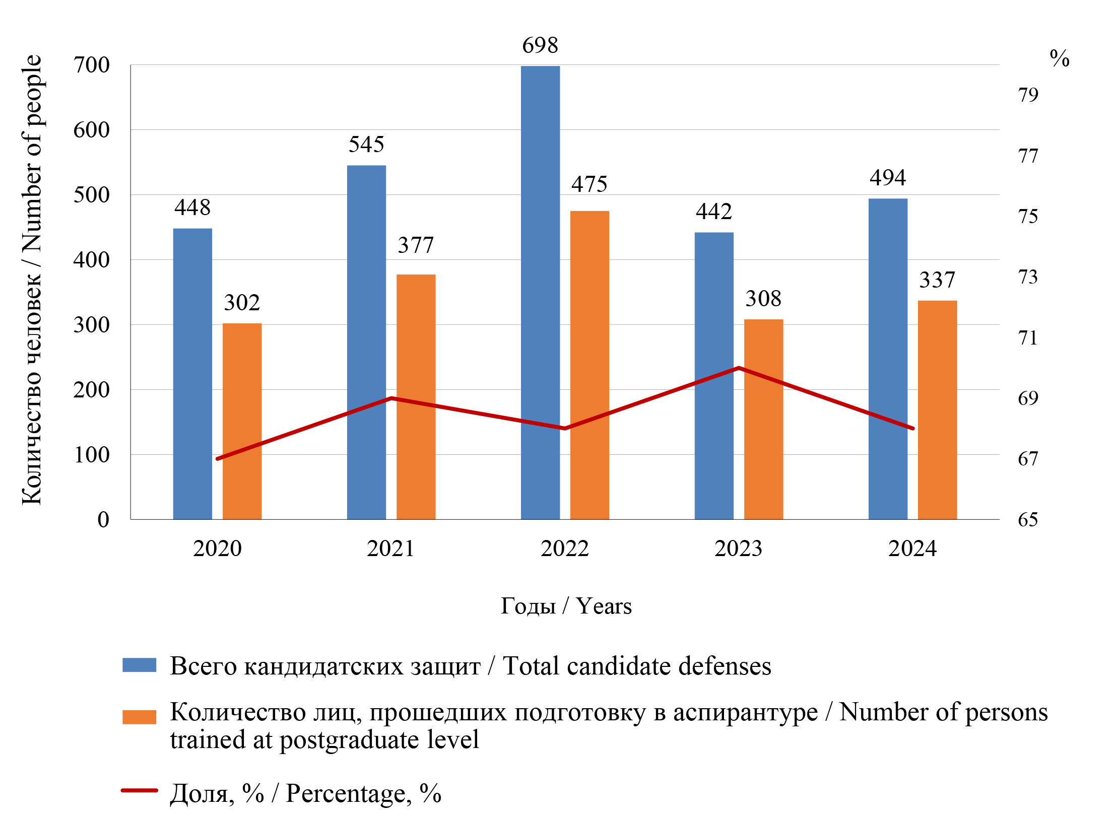 Доля прошедших подготовку в аспирантуре соискателей ученой степени кандидата экономических наук стабильна во временном интервале с 2020 по 2024 гг. и составляет в среднем 69 %.