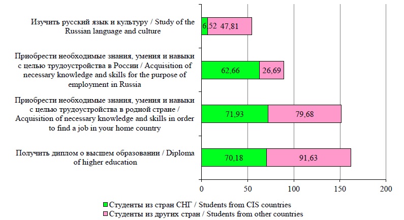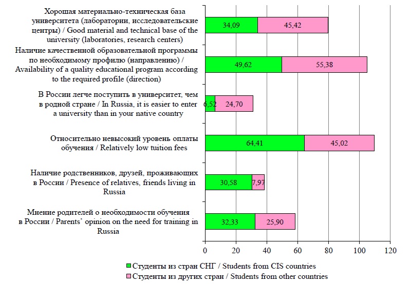 Притягивающими факторами для студентов из стран СНГ являются быстрая адаптация в России за счет родственных традиций и культуры, знания русского языка, стабильности экономики и дружественных отношений с родной страной. Отталкивающими факторами в родной стране являются недостаточное количество рабочих мест, низкий уровень жизни и развития экономики и кризисное состояние качества высшего образования. Для обучающихся из других стран наиболее притягательными являются богатая культура, традиции, архитектура и природные объекты, а отталкивающими в родной стране – сложность поступления и ограниченная доступность высшего образования.