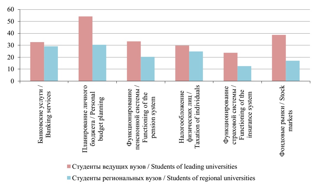 Самооценка студентами региональных вузов своей финансовой грамотности показала недостаточный уровень финансовой грамотности, свидетельствующий об отсутствии у них достаточных знаний основ финансовой системы страны, особенностей банковской сферы, налогообложения, а также умений правильно сберегать, потреблять, инвестировать свои денежные средства и др. Вместе с тем студенты отметили у себя понимание важности формирования необходимого уровня финансовой грамотности, а также готовность участвовать в различных формах обучения по финансовым вопросам.