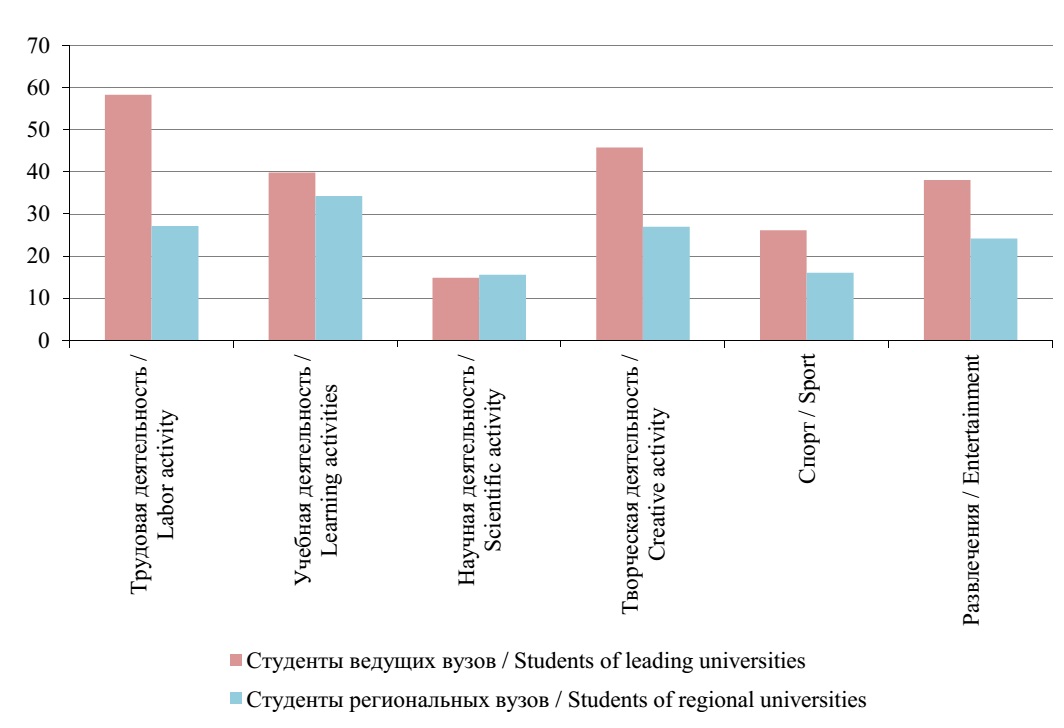 Анализ направлений деятельности, к которым студенты испытывают в студенческие годы особую тягу, показал, что для 27,2 % студентов региональных вузов в приоритете трудовая деятельность, т. е. они или уже работают, или находятся в ее поиске. Обучающиеся ведущих вузов в большей степени ориентированы на трудовую деятельность (58,3 %) (рис. 2). 34,3 % студентов региональных вузов помимо приоритетной учебной деятельности указали только одно направление своей жизнедеятельности, к которому они испытывают особую тягу. Студенты ведущих вузов отметили не менее трех приоритетных направлений жизнедеятельности, что свидетельствует о наличии у них больших возможностей раскрывать свой потенциал в различных сферах жизни.