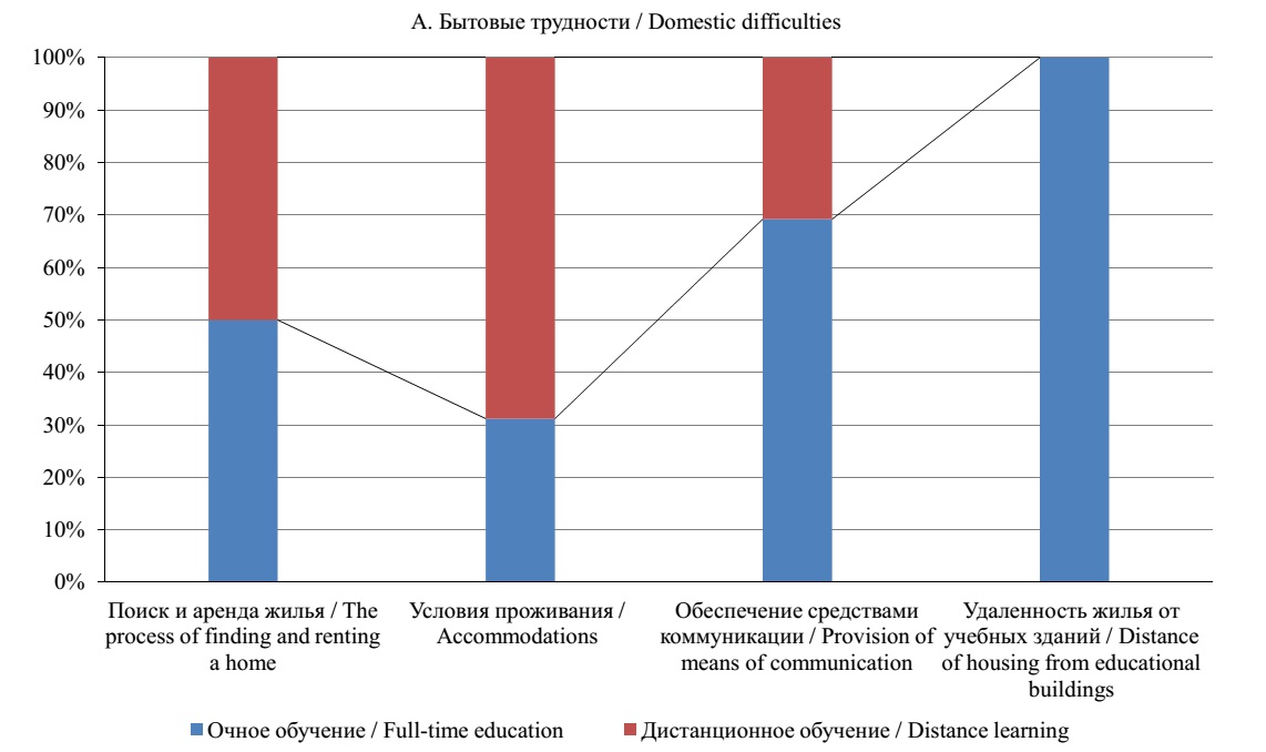 Аренда жилья оказалась одинаково сложной для студентов как очной, так и гибридной форм обучения. Относительно средств коммуникации для онлайн-обучения все студенты отметили в комментариях, что проводили интернет за свой счет. Для обучающихся в доковидный период эта необходимость появилась впервые, они не имели возможности узнать у старших товарищей обо всех тонкостях заключения договоров на проведение сети Интернет в Германии. Поэтому для них данный вопрос оказался более сложным, чем для студентов следующего года. Однако условия проживания гораздо больше отразились на обучающихся в период пандемии (рис. 12).Это явно оказывало весьма существенное влияние на успеваемость, что следует из комментариев: «… в моей квартире не было воды, стояла сломанная нерабочая плита, а новая плита появилась только спустя 2 недели» (студентка К, удаленная форма), «…появились тараканы, я тараканов очень боюсь, создал заявку, но мне ее не выполнили, и я несколько месяцев жил с тараканами … это был большой стресс для меня» (студент Т, удаленная форма обучения). Безусловно, подобные условия проживания не могли не привести к снижению успеваемости любых иностранных, в том числе и русскоязычных, студентов. Вопрос обеспечения студентов общежитием является одним из факторов повышения успеваемости в любом вузе [29]. Очевидно, что студенты ГРИНТ оказались недостаточно информированы о возможностях предоставления общежития в кампусе, а также не готовы к специфике процедур предоставления там мест для проживания. Так, студент И, очная форма обучения, отметил в комментариях: «… установлено правило, что заселяют только студентов, прибывших более чем на 1 год учебы» – что не соответствует действительности. Места в общежитии предоставляются в порядке очередности, очередь формируется согласно онлайн-заявкам в специальную службу университета. Студенты ГРИНТ поздно подают подобные заявки, в результате чего очередь на заселение может подойти только к концу семестрового обучения в ТУК.