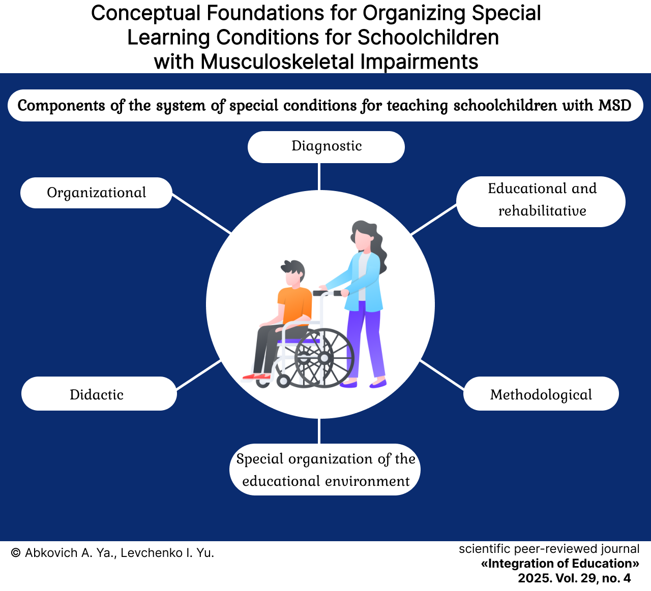 Introduction. The transformation of the school education system for children with musculoskeletal impairments, driven by changes in public life and legislation, is a response to the social demand for the quality and accessibility of education for children with disabilities and special educational needs. However, there is a lack of research focused on the qualitative peculiarities of the development of modern children with motor impairments, their specific educational needs, and the conditions necessary for their successful learning. The aim of the study is to develop a system of special learning conditions for schoolchildren with musculoskeletal impairments.