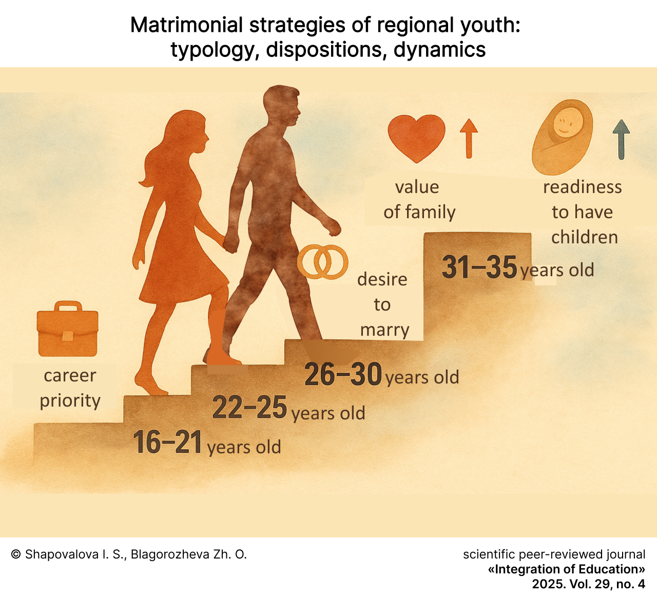 Results. Problems related to risky indicators of non-obligatory childbearing in the 18–21 year old youth group have been identified. Despite the connection between the matrimonial dispositions of regional youth and the priority of family and its values, this position solidifies with age, highlighting the significant role of educational institutions in mitigating demographic risks. Problematic issues concerning gender emphases in matrimonial dispositions and choices have been formulated, demonstrating a lesser orientation towards family and childbearing among young women compared to men. Risks of the devaluation of family values and the diminished significance of matrimonial plans for youth with low economic income have been identified.