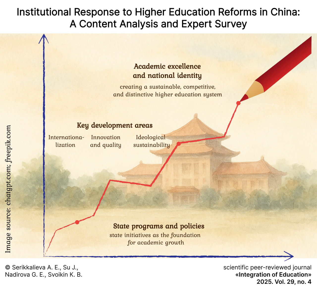 Materials and Methods. As part of the study, a survey was conducted among 68 experts representing universities, teacher training colleges, schools, and educational institutions of various levels, including central and regional organizations related to China’s higher education system. An in-depth interpretation of the results and verification of the identified trends were carried out through an analysis of regulatory acts and policy statements by the senior leadership of the PRC on the development of higher education. A content analysis was conducted to track changes in rhetoric in official documents from different years. At the final stage, empirical data were compared with the results of the content analysis, which ensured the integrity and validity of the research conclusions.