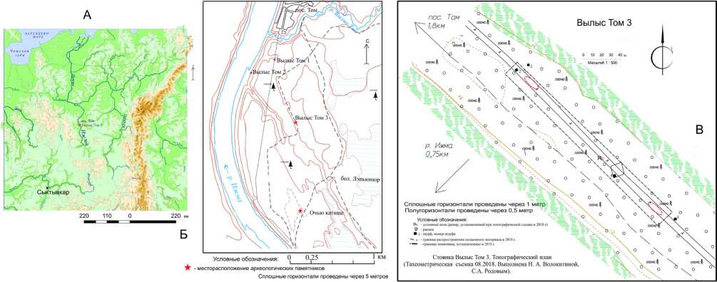 Fig. 1. The site Vylys Tom 3: A – location of the site on the map of the Komi Republic; Б – simplified map; В – topographic plan of the site Vylys Tom 3.