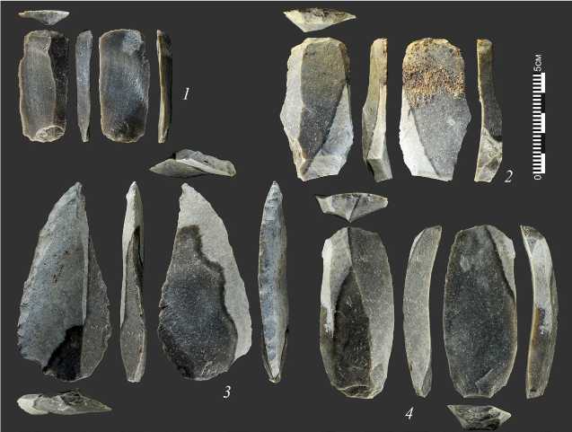 Fig. 2. The site Vylys Tom 3: 1 – side-scraper; 2 – backed knife; 3 – ax; 4 – abrasive.