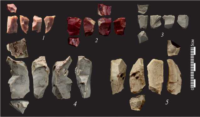 Рис. 4. Стоянка Вылыс Том 3: 1 – нуклеус в завершающей стадии расщепления; 2 – обломок пластины; 3 – резец на углу; 4, 5 – скребки двулезвийные.