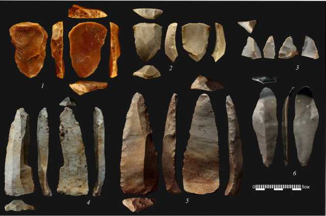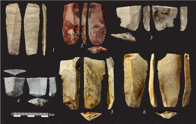 Рис. 7. Стоянка Вылыс Том 3: 1 – ретушированная пластина; 2-6 – обломки пластин с эпизодической ретушью.