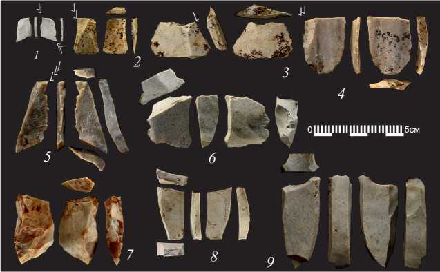 Рис. 9. Стоянка Вылыс Том 3: 1, 2, 4, 5 – резцы на углу сломанной пластины; 3 – ретушной резец; 6-9 – нуклеусы-резцы.
