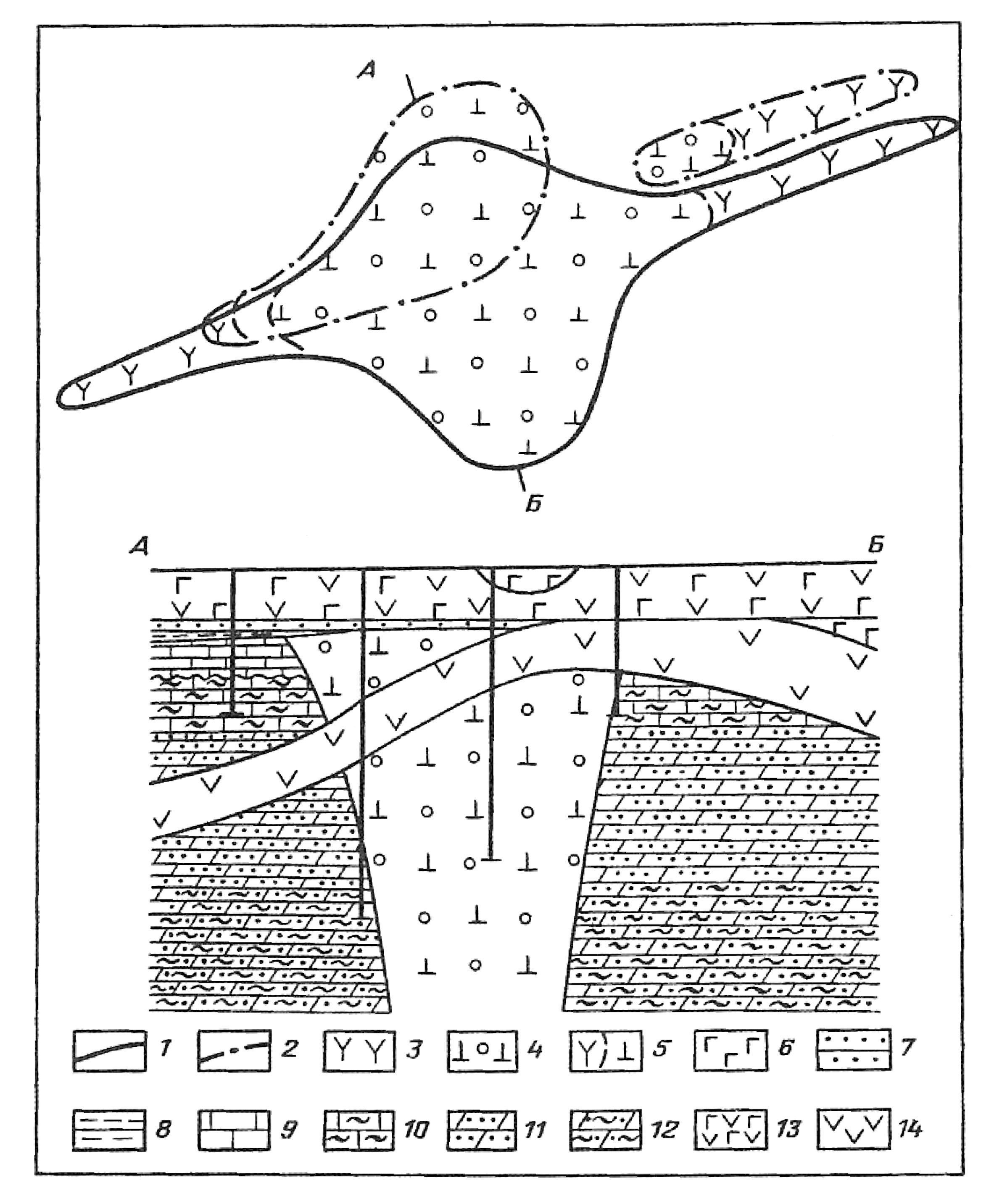 Рисунок 3. План и разрез кимберлитовой трубки Комсомольская [42]: 1 – контур рудного тела под перекрывающими породами; 2 – контуры отторгнутых блоков трубки; 3 – порфировые кимберлиты первой фазы внедрения; 4 – автолитовые кимберлитовые брекчии второй фазы внедрения; 5 – границы между разновидностями кимберлитов; 6 – долеритовые туфы пермо-триаса; 7, 8 – песчаники (7) и алевролиты (8) пермо-карбона; 9 – известняки нижнего силура; 10–12 – известняки глинистые (10), доломиты песчанистые (11) и песчано-глинистые (12) среднего и нижнего ордовика; 13 – базальты эффузивной фации нижнего триаса; 14 – долериты интрузивной фации пермо-триаса.
