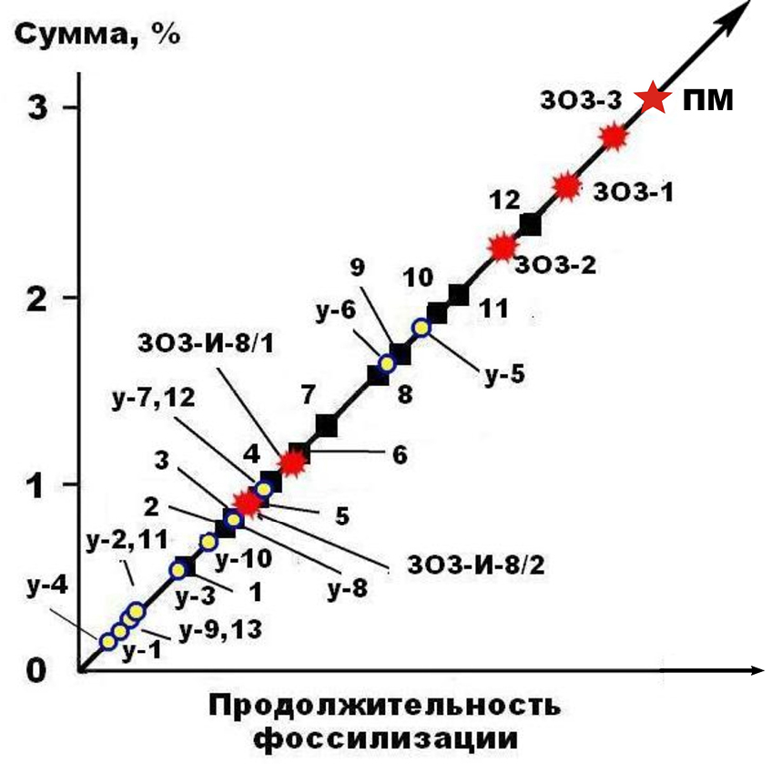 В составе исследованного бивня обнаружены 46 микроэлементов, общее содержание которых превышает 3 мас. % (табл. 2). По этому показателю бивень превосходит практически все исследованные нами ископаемые кости плейстоценовых животных (рис. 5), что подтверждает относительную древность печорского моржа. В состав микроэлементов, находящихся в бивне, входят девять эссенциальных (жизненно-необходимых), 18 физиогенно-активных (разного происхождения) и 19 абиогенных (элементы, обусловленные фоссилизацией). Отношение эссенциальных элементов к абиогенным (Э/АБ), отражающее степень фоссилизации ископаемых костей, в рассматриваемом случае не достигает 16, что демонстрирует редкий для ископаемых костей дефицит ксеногенных элементов-примесей. Отношение эссенциального цинка к преимущественно абиогенной меди превышает 82, отражая тот же феномен дефицита элементов-антибионтов. Таким образом, оба микроэлементных отношения в бивне печорского моржа указывают на удивительно хорошую сохранность кости, несмотря на ее относительно большую древность.